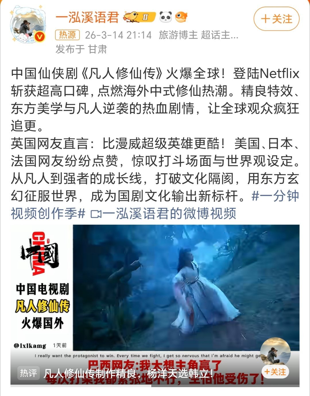中国仙侠剧凡人修仙传火爆全球凡人修仙传确实很好看。杨洋又帅演技又好。期待第二部!