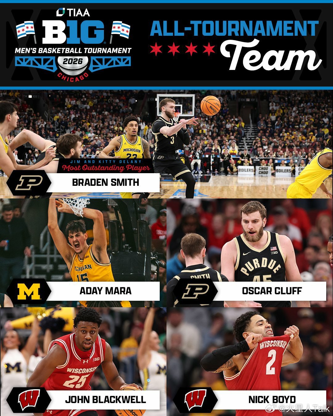 NCAA男篮 2025-2026赛季Big Ten联盟锦标赛决赛普渡大学击败常规赛冠军密歇根大学,夺得校史第三个锦标赛冠军。锅炉工Oscar Cluff11中7得到21分。Trey Kaufman-Renn15中10得到20分。Braden Smith荣获MOP,12中6得到14分11助攻3抢断,1075个助攻距离追平Bobby Hurley只差一个。Fletcher Loyer7中4,14分5助攻。狼獾Yaxel Lendeborg14中8,20分5篮板。Aday Mara9中7得到14分5篮板。Elliot Cadeau12中4得到10分10助攻。Nimari Burnett9中5得到12分。替补McKenney6分6篮板。