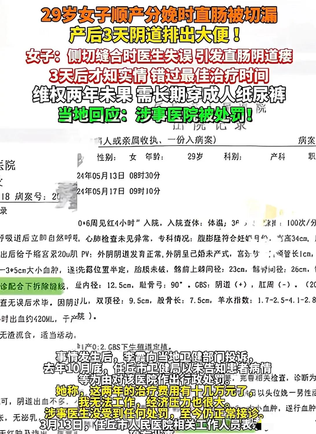 “追责到底!河北任丘,女子顺产生完孩子第3天,大便从阴道漏出,这才得知一个骇人真相:医生在进行侧切缝合手术中,操作失误,将她的直肠切漏了,术后选择了隐瞒。随即女子转院,进行了修复手术,可手术失败,她需要长期穿纸尿裤,生活几乎全毁。可让女子更气愤的是,2年下来,她花了10多万医疗费,可一分赔偿都没拿到,医院推诿,医生正常接诊。网友:这医生真的毁了别人一辈子,毫无担当,发现问题,及时修复,兴许还能挽回。” 29岁的李女士原本满心欢喜迎接新生命的到来,却没想到这场分娩成了她人生的噩梦。产后第三天,当她发现身体出现异常排泄物时,整个人都陷入了崩溃。更让她绝望的是,医院直到这时才承认,侧切缝合时的操作失误导致了直肠阴道瘘,而他们选择了隐瞒病情,让她错过了最佳治疗时机。 之后的两年里,李女士辗转多家医院,光是抗感染治疗和修复手术就花光了家里的积蓄,可结果还是不尽如人意。她不得不长期穿着成人纸尿裤,不敢出门,不敢和朋友聚会,连最基本的生活自理都成了难题。曾经爱笑的她变得沉默寡言,原本幸福的家庭也被这场医疗事故蒙上了阴影。 更让人心寒的是,涉事医院和医生的态度。面对李女士的维权诉求,医院要么推诿扯皮,要么避而不见,当初操作失误的医生依旧正常接诊,仿佛什么都没发生过。这种冷漠和逃避,比医疗失误本身更伤人。它让我们看到,在某些医疗机构眼里,患者的健康和尊严,似乎远不如医院的声誉和医生的饭碗重要。 这件事也撕开了医疗行业里最刺眼的一面:当失误发生时,选择隐瞒还是坦诚,往往决定了患者的一生。如果当时医生能第一时间告知真相,及时进行补救,或许李女士的病情不会恶化到如今的地步。可一句“怕担责任”,就把一个家庭的未来推向了深渊。 我们常说“医者仁心”,可仁心从来不是一句口号,而是面对错误时的担当,是对患者生命的敬畏。医疗行业允许失误,但绝不允许隐瞒和推诿。当患者把最脆弱的一面交给医生时,换来的不该是欺骗和伤害,而是坦诚与负责。 如今当地虽已对涉事医院作出处罚,但对于李女士来说,这远远不够。这次的隐瞒,给她带来了一生的不安,彻底改变了她的人生轨迹。曾经对未来的憧憬,变成了日复一日与病痛的对抗;曾经可以肆意拥抱孩子、拥抱生活的权利,被一纸诊断书狠狠剥夺。她的人生,从迎接新生命的喜悦,被硬生生拽进了漫长的维权和康复泥潭,这份创伤,将伴随她往后的每一个日夜,再也无法抹去。 各位读者你们怎么看?欢迎在评论区讨论。
