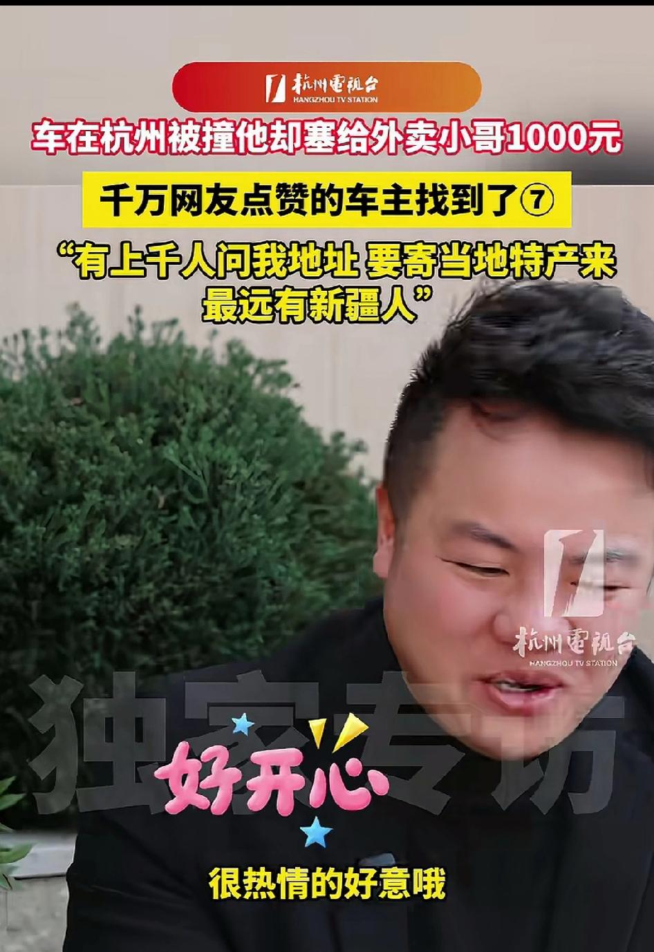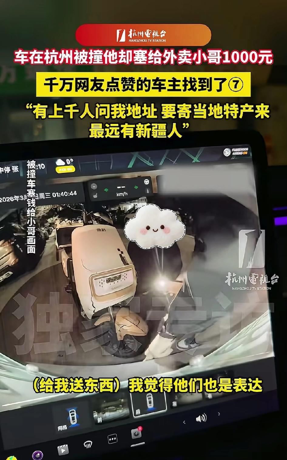 暖心!车被追尾,他不仅没索赔,竟倒贴1000块钱!被全网千万点赞的暖心车主找到了!上千网友要给他寄特产,没想到最远的竟来自新疆,说要给他寄葡萄干! 2026年3月4日凌晨1点40分左右,杭州的深夜已经彻底静下来,大多数人早已熟睡。某小区停车场附近的道路上,只有零星灯光和偶尔驶过的车辆。一名外卖小哥骑着电动车,在夜色里争分夺秒赶送餐,生怕超时被扣单。 就在经过一辆停在路边的轿车时,因为夜间视线差、车速没控制好,电动车“咚”的一声,狠狠撞上了轿车车尾。车尾立刻出现了明显的擦痕和小面积凹陷。 寂静凌晨里的这一声碰撞,格外刺耳。 外卖小哥当场慌了神,脸色发白,手心全是汗。他顾不上自己有没有受伤,第一时间跑去看车损,心里又愧疚又害怕。他很清楚,修车少说也要几百上千,而自己跑一单才几块钱,这一撞,可能要白跑好几天。 他局促地站在车旁,低着头,做好了被骂、被索赔的准备。 车主很快赶到现场。 很多人以为他是不差钱的老板,可事实并非如此。他只是一个普通创业者,早已成家,有妻子、有孩子,有安稳的小家庭,也有房贷、孩子教育这些固定开销,每一分钱都要精打细算,修车费用同样需要他自己承担。 小哥声音发颤,不停道歉:“对不起对不起,是我不小心,我先赔你400块维修费,我现在就转给你。不够的我在慢慢还” 他姿态卑微,就怕车主不接受,更怕对方要价太高。 车主蹲下身,仔细看了看车损,又抬头看了看眼前这个凌晨还在奔波、满脸疲惫又慌张的小哥。对方破旧的工服、有些磨损的电动车、眼神里藏不住的窘迫,他全都看在眼里。 车主心里一下就软了。 他也是从底层打拼过来的,太懂成年人凌晨讨生活的不容易。一点小意外,对他来说只是修车麻烦,可对外卖小哥来说,可能就是压垮人的负担。 他直起身,轻轻摆手,语气温和却坚定: “不用你赔,一点小伤,没事。” 小哥愣住了,以为自己听错,还在坚持要赔钱。 下一秒,车主做出了让所有人意外的举动。 他从钱包里拿出1000元现金,直接塞进小哥手里: “你拿去把自己的电动车修一修,别耽误送餐,安全最重要,快去忙吧。” 小哥彻底懵了。 撞了别人的车,不用赔钱,对方反而给自己钱? 他连连后退,双手使劲推辞,眼眶瞬间就红了,反复说:“不行不行,这钱我不能要。”长这么大,他很少遇到这样的善意,又暖又愧疚,整个人都不知所措。 车主坚持把钱塞给他,拍了拍他的肩膀,没有一句责备,只有体谅。 小哥最终拗不过,颤抖着手收下钱,对着车主深深鞠躬,一遍又一遍地道谢,声音都带着哽咽。那个冰冷的凌晨,这份突如其来的温柔,像一束光,照进了他最窘迫的时刻。 事后修车,车主实实在在花了一笔钱。 家里有房贷、有孩子要养,这笔支出并不算轻,但他半点儿不后悔: “比起让一个打工人雪上加霜,这点损失不算什么。” 他的家人也全力支持。妻子在采访里说: “他一直是个心软的人,看到别人难就忍不住想帮一把。这次车虽然被撞了,但我们都觉得,做得对。” 这段行车记录仪视频一曝光,立刻全网刷屏。 没有狗血,没有争吵,没有对立,只有普通人之间的将心比心,却看哭千万网友。 大家疯狂点赞,称他“格局拉满、心底有温度”。 网友们自发寻找这位暖心车主,上千人留言要他家地址,想寄特产表达敬意。 有人寄零食,有人寄土特产,最远的一位网友来自新疆,说要给他寄最好的葡萄干。 3月中旬,杭州电视台终于找到他,做了独家专访。面对镜头,他特别低调,反复说:“我只是做了一件小事,不值得大家破费。” 他婉拒了所有特产,只说:“看到他当时慌张愧疚的样子,我就想起自己年轻时打拼的经历,都不容易,能帮一把就帮一把。” 一场小小的追尾,没有变成矛盾,反而变成了杭州深夜最暖的一幕。 消息来源:网络公开内容,本文配图/视频素材来自网络,仅用于纪实分享与社会观察,如有侵权请联系删除,谢谢