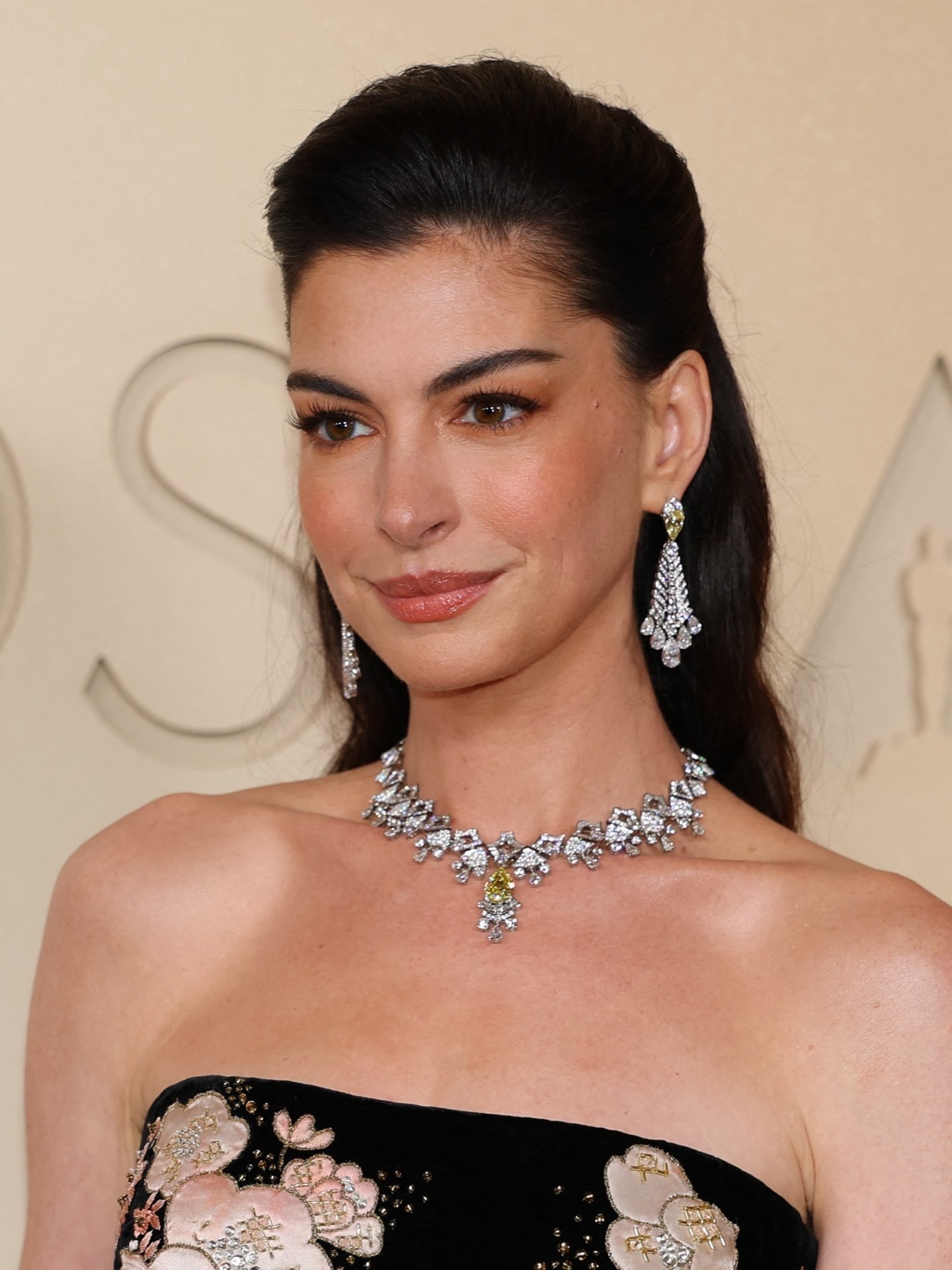 安妮海瑟薇以一条Valentino 2026春夏高级定制系列抹胸黑色礼服出席第98届奥斯卡颁奖典礼。裙身绽放着精致花卉图案刺绣,柔粉花瓣栩栩如生。贴合身线的剪裁向上收束腰肢加以腰带修饰,向下延展为流畅的美人鱼廓形,搭配标志性长款手套,复古典雅。