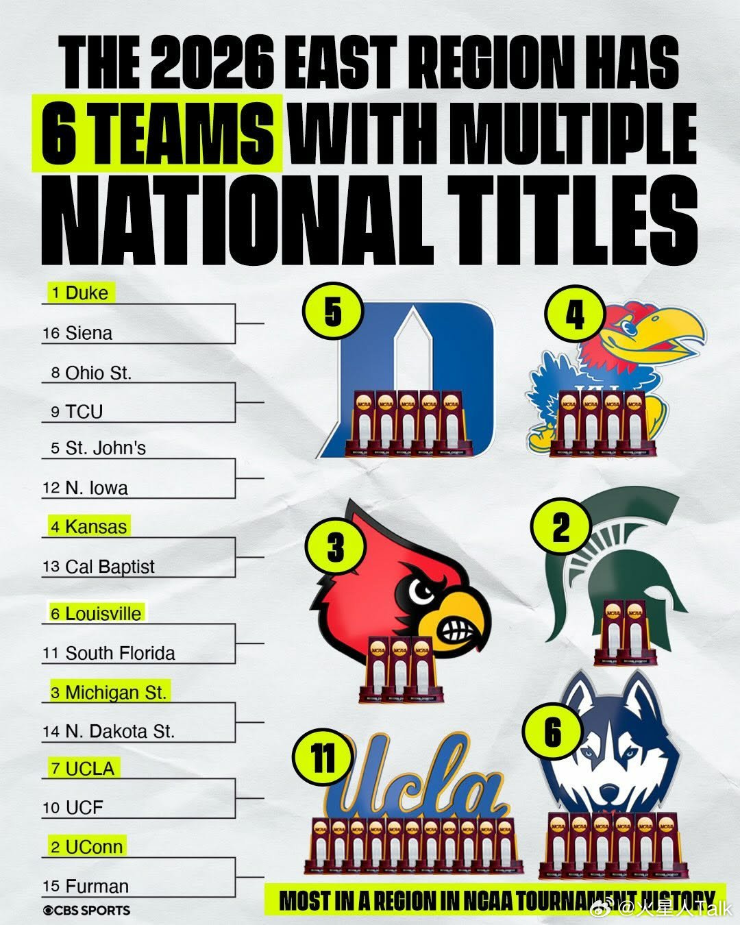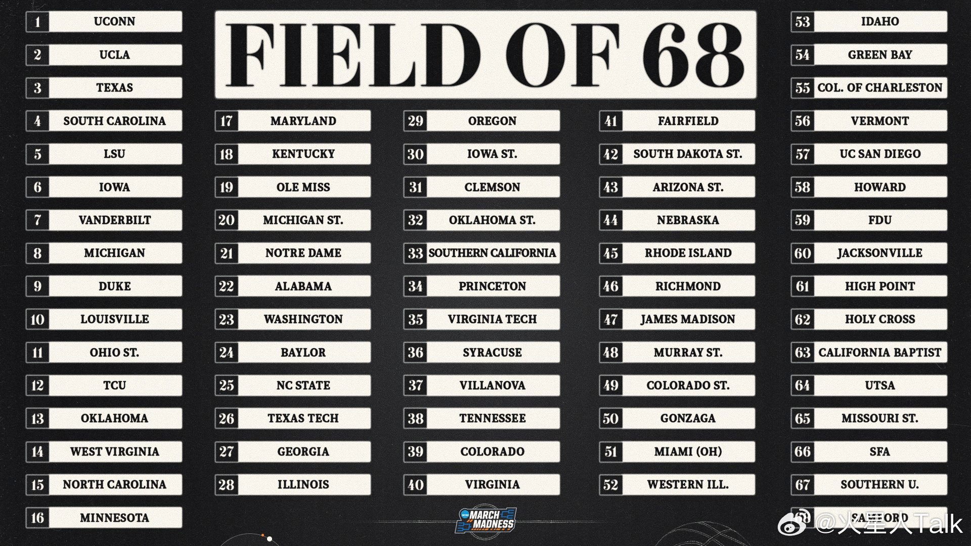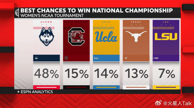 ESPN AnalyticsNCAA男篮 杜克大学23%的概率夺冠,密歇根大学16%的概率和亚利桑那14%的概率紧随其后。NCAA女篮 康涅狄格大学48%的概率卫冕成功,南卡罗来纳大学、加州大学洛杉矶分校和德州大学概率差不多。