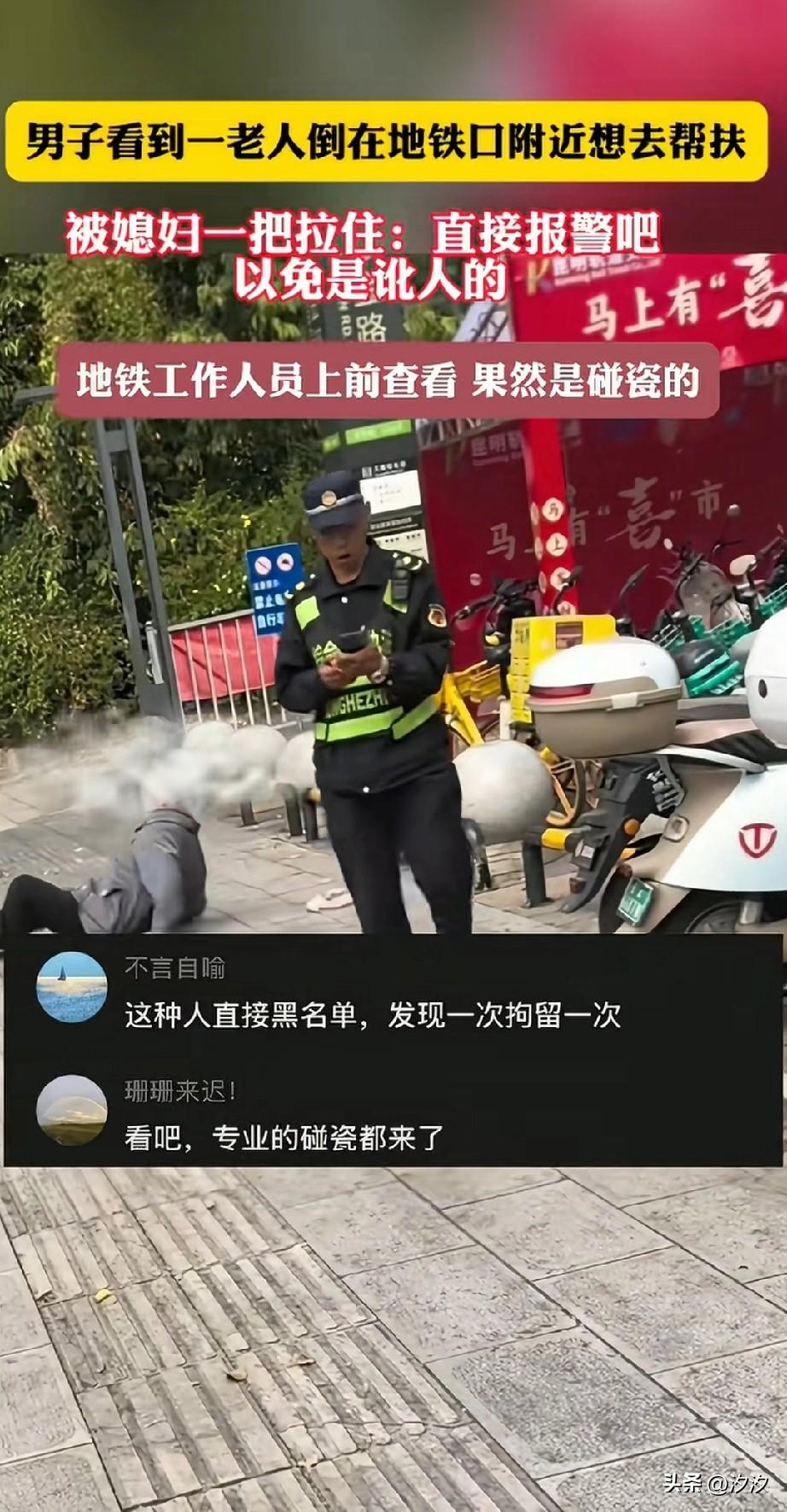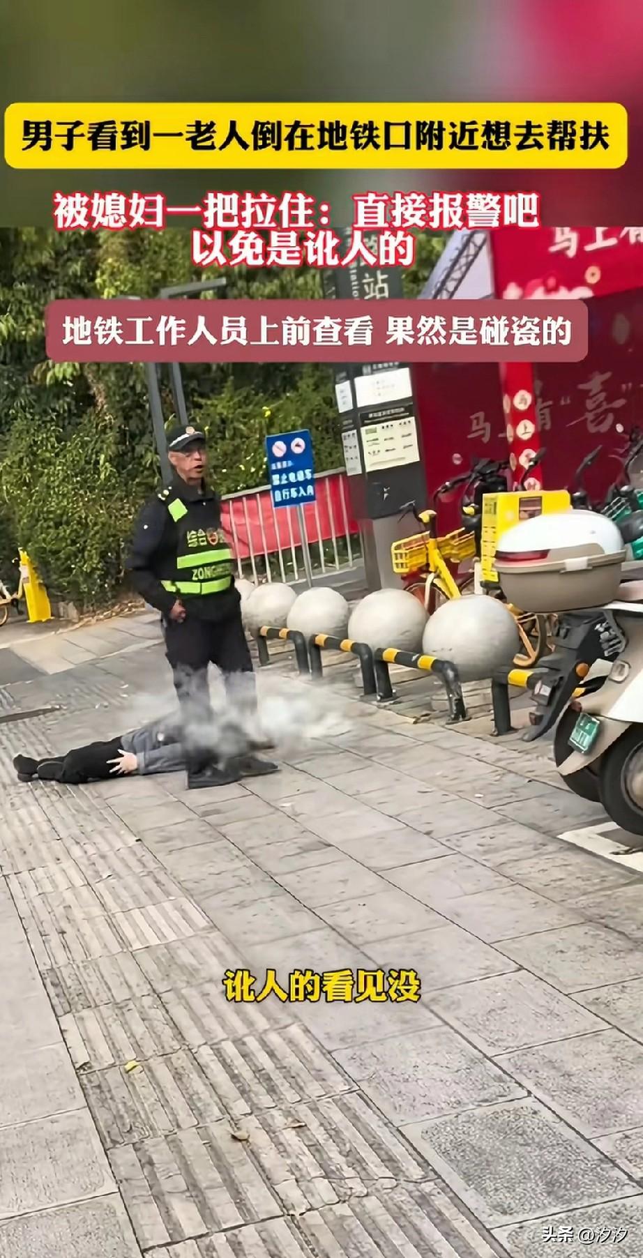 男子在地铁口发现一名老人躺在地上, 出于好心就想上前帮助, 但是他的老婆及时拉住了他, 说这老头可能是碰瓷, 两个人的吵闹引起了地铁工作人员的注意,地铁巡逻的工作人员上前查看, 发现老头一点事儿都没有, 就是想碰瓷, 工作人员掏出手机汇报工作, 躺在地上的老头以为对方要报警, 于是迅速的站起身来, 网友看到这样的场景, 纷纷表示这样的人就应该报警, 让叔叔来处理这种人, 发现一次,拘留一次, 可以说这个老人凭借自己的一己之力, 让全国再次陷入了不敢扶老人的境地, 这种讹人的人实在太坏了! 大家对于老头碰瓷这种行为怎么看? 地铁提速生活 扶不扶 老人意外倒地 大爷地铁不文明 公交站晕倒 上海地铁老奶奶