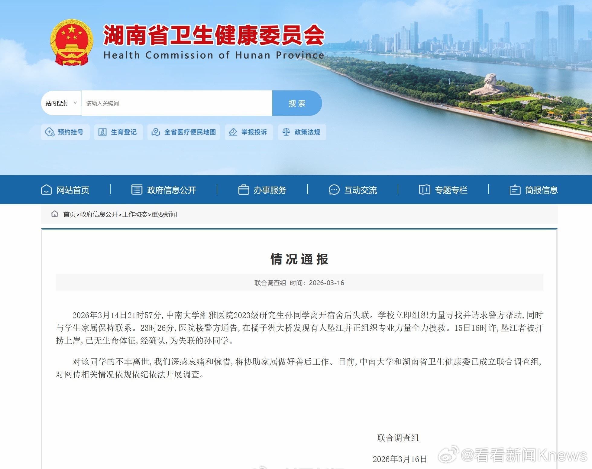 【#官方通报失联研究生坠江##失联研究生坠江依法开展调查#】中南大学和湖南省卫生健康委员会联合调查组3月16日发布情况通报: