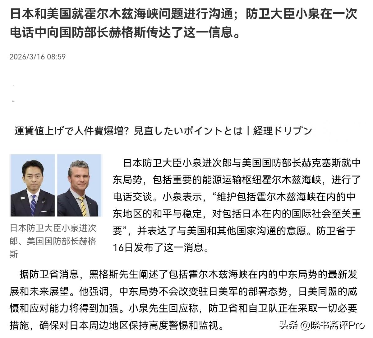 高市早苗难办了!日本不表态,美国国防部长赫格塞斯直接一通电话打到了日本,对日本施压!3月16日,根据产经新闻报道,日媒称,日本和美国就霍尔木兹海峡问题进行沟通。赫格塞斯阐述了包括霍尔木兹海峡在内的中东局势的最新发展和未来展望。并称中东局势不会改变驻日美军的部署态势,日美同盟的威慑和应对能力将得到加强。 日媒特意点名,14日,美国总统特朗普表示希望日本和其他国家派遣军舰以确保霍尔木兹海峡的安全。很显然,对于是否派军舰护航霍尔木兹海峡,高市早苗的态度就一句话,那就是拖延,能拖一天是一天。当然,在美国看来,日本的态度本质上就是不想加入护航。因此,这才有了赫格塞斯专门给小泉进次郎打电话一事。 为什么日本政府是这种态度呢?其中原因有三,其一是,如果日本派军舰护航,这样的行为本质上就是以军事介入正在交战的冲突之中,这直接触碰日本宪法第九条与“专守防卫”原则。若日本在美国的要求下护航,这等于启动了美日安保条款,把伊朗当成了敌国。若日本派军舰,日本船只,军舰恐怕都可能成为攻击的目标。 其二是,日本能源高度依赖从中东的进口,日本如此明目张胆的选边站队,这就是拿日本的能源供应安全开玩笑。高市早苗当然不敢冒险。其三是,日本若答应美国,日本国内必然会引起反弹。拿自卫队去冒险,日本国内缺乏民意支持,更凸显日本对于美国的附属地位。当然,不答应,日本又怕美国不满。很显然,高市早苗现在是左右为难,被卡住了。即便高市早苗想躲,美国肯定也不会轻易放过日本。