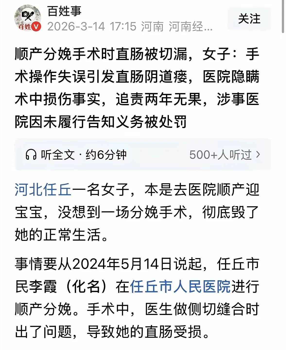 河北任丘,女子在医院顺产生下一子,谁料3天后,她如厕时竟从阴道排出大便,一查才发现患上直肠阴道瘘,原因竟是医生做侧切缝合时失误,扎穿了她的直肠,而事后医生对此只字不提,导致女子错过了最佳治疗时间,无法再修复,后半生都要穿着成人纸尿裤度日,还落下一身病,更让女子气愤的,还在后面…… 29岁的李霞,是河北任丘一名普通女子,2024年5月14日,她怀着满心欢喜走进当地医院,准备顺产生下自己的第一个孩子。 对她来说,这本该是人生中最幸福的一天,可谁也没想到,这场看似寻常的生产,会把她拖进万劫不复的深渊。 顺产时的侧切缝合,是产科再常见不过的操作,大多数产妇都要经历,大家也默认这是安全且成熟的流程,李霞也不例外,她全程信任医护人员,从未想过会出意外。 可意外,偏偏就发生了。 手术过程中,负责缝合的医生手抖了一下,针线不仅缝好了侧切的皮肉,还不小心扎穿了李霞的直肠黏膜。 更让人脊背发凉的是,医生当时就发现了自己的失误。 从李霞后来拿到的病历记录里能清楚看到,手术中医生曾发现有一针缝线穿透直肠黏膜,还拆了线重新缝合,可他却选择了一声不吭,把这件事瞒得严严实实。 术后查房时,医生只轻描淡写地跟李霞和家属说“大人孩子都平安”,随后叮嘱李霞只能吃术后查房之际,医生只是轻描淡写地告知李霞及其家属“大人孩子皆平安”。 而后,他嘱咐李霞仅可进食无渣流食,便脚步匆匆地离去了。 没人知道,这句看似正常的叮嘱,其实是医生为了掩盖失误的手段——控制饮食减少粪便,赌伤口能自行愈合,保住自己的奖金和工作。 这份刻意的沉默,整整持续了三天。 产后第三天,李霞起身如厕时,突然感觉到不对劲,阴道里竟有粪便排出,一股刺鼻的恶臭瞬间弥漫开来,羞耻和恐惧像潮水一样将她淹没。 她慌了神,家人也立刻意识到事情不简单,赶紧带着她转院就医。 可这三天的拖延,已经让伤口发生了严重感染,最佳治疗时机彻底被错过了。 他们先前往当地另一家医院,奈何医生见感染状况极为严重,径直拒绝收治。 万般无奈之下,这一家人只好辗转奔赴天津的医院,踏入天津的医院,医生细致检查后,给出的诊断结果如晴天霹雳般令人震惊——竟是直肠阴道瘘。 简言之,直肠与阴道间出现穿孔,肠道粪便会不受控地从阴道排出,加之感染时久,瘘口周边组织受损严重,使得修复工作面临极大挑战。 接下来的日子,李霞陷入了无尽的痛苦之中。 她历经一载抗感染治疗,终迎来修复手术之机,然而,命运弄人,这场手术最终功败垂成,令人扼腕叹息。 医生告诉她,要是再找不到顶尖专家,她后半辈子可能就要在肚子上挂造口袋,彻底失去正常的排泄功能。 如今的李霞,每天都要穿着成人纸尿裤,身上总有一股洗不掉的异味,时不时就会出现漏气、漏便的情况,反复的感染让她经常发烧。 因为长期住院,她没能坐好月子,身体越来越差,还落下了风湿病,原本的工作也彻底丢了,只能靠营养液维持身体。 两年时间里,十几万的医药费和维权费用,像一座大山压得整个家庭喘不过气,曾经幸福的小家,因为这场医疗事故变得支离破碎。 可比起身体的痛苦,更让李霞气愤的,是涉事方的冷漠和推诿。 事发后,李霞和家属多次找涉事医院要说法,希望能追究医生的责任,可医院始终敷衍了事,像踢皮球一样来回推诿。 更令人心寒的是,那个造成失误、又刻意隐瞒的医生,在协助李霞转去天津就医后,直接拉黑了家属的微信和电话,再也不回应,如今依然穿着白大褂在医院正常接诊,仿佛什么都没发生过。 2025年10月底,相关部门终于给出了处理结果,以医院“未按规定书写病历、未履行病情告知义务”为由,罚款5万元。 这个数字,对一家正常运营的医院来说,可能连几个月的水电费都不够,却轻飘飘地概括了李霞被毁的一生。 李霞想不通,为什么只罚医院,却不追究涉事医生的责任?她找到相关部门询问,得到的回复竟是“一案不两罚”。 可在她看来,医院和医生是两个独立的主体,医生的失误和隐瞒,不该被医院的罚款一笔带过。 李霞的遭遇,不是个例,却暴露了医疗领域的诸多漏洞。 医患之间的信息不对称,让患者在面对医疗失误时格外弱势;追责机制的失衡,让医疗失误的成本过低,也让一些医护人员丧失了职业底线。 我们理解医疗行业的复杂性,也尊重医护人员的辛勤付出,谁都可能犯错,但犯错后选择隐瞒、推卸责任,就是对生命的不尊重。 救死扶伤是医护人员的天职,不能因为一己私心,就毁掉一个人的人生、一个家庭的幸福。 现在,李霞还在维权的路上奔波,她封存了所有病历,申请了医疗事故鉴定,一心想为自己讨回公道。 她的坚持,不仅是为了自己,也是为了所有可能面临类似困境的患者。