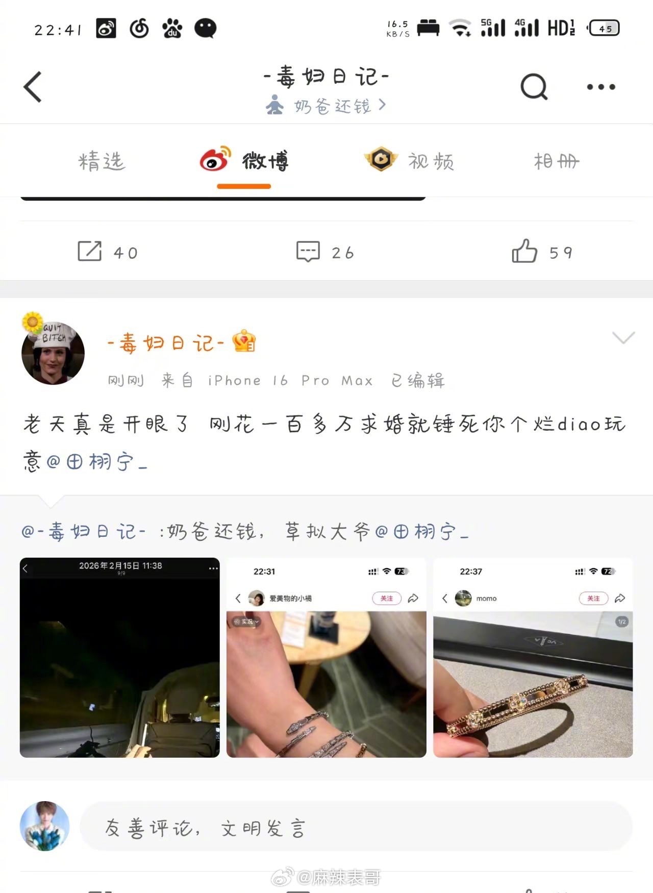 有趣的是,官宣的那天,粉丝在给他冲商务,田栩宁在给若若求婚。粉丝在网上祝福哥哥情人节快乐,哥哥在给若若买大钻戒。
