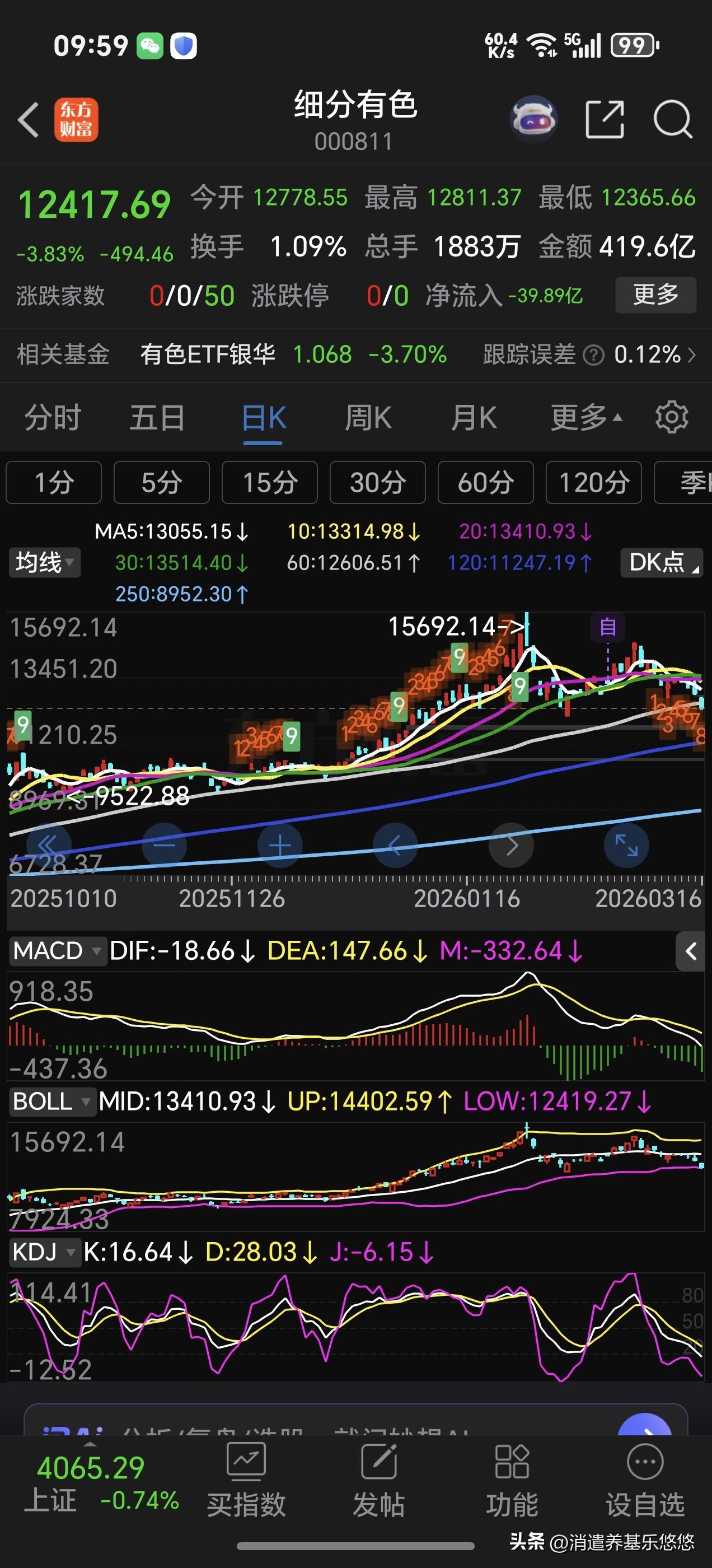 今天早盘主力杀有色金属,目前跌幅超3.5%,盘中跌破60日线重要支撑,下午收不回来60日线支撑,后面还要下跌,真是让人心寒!守住了60日线支撑,今天也是一个加仓点,割肉有点痛!