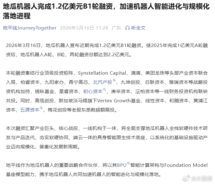 地瓜机器人完成 1.2 亿美元 B1 轮融资,A+B 轮累计融资达 2.2 亿美元