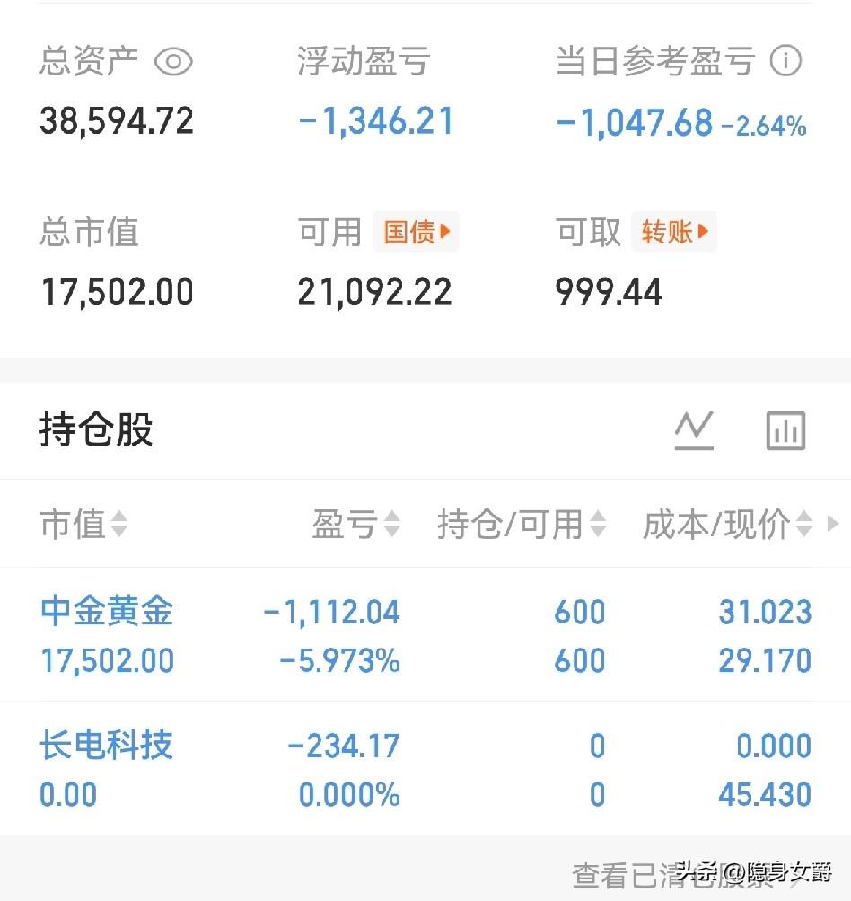 今天亏了1000多, 赚了一周才赚2700多,一天就进去一半,股票真不是普通人能玩明白的。 长电科技守了一上午,终于涨到45以上了,立马割肉234块卖了,结果卖后一直涨,晚卖一两分钟就又少亏100多。下午开盘如果再涨,更后悔。 黄金我是上周五看跌了点,就入手600股,结果周末跌了个底朝天。这个不卖,我相信黄金会反弹,放着。 上周想买中油,没钱了,结果中油开盘就涨停。买啥呢?热门高点的不敢买。