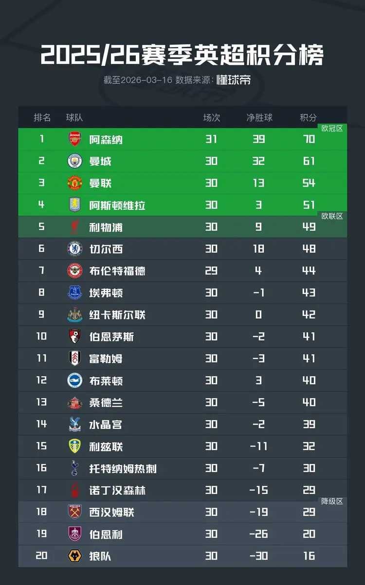 英超前30轮过后,阿森纳在多赛一场的情况下领先曼城多达9分排名榜首。在五支争夺欧冠资格的球队中,击败维拉的曼联则积54分排名第三,维拉51分第四,利物浦49分第5,切尔西48分第6,本轮尚未进行比赛的布伦特福德则积44分排名第7。