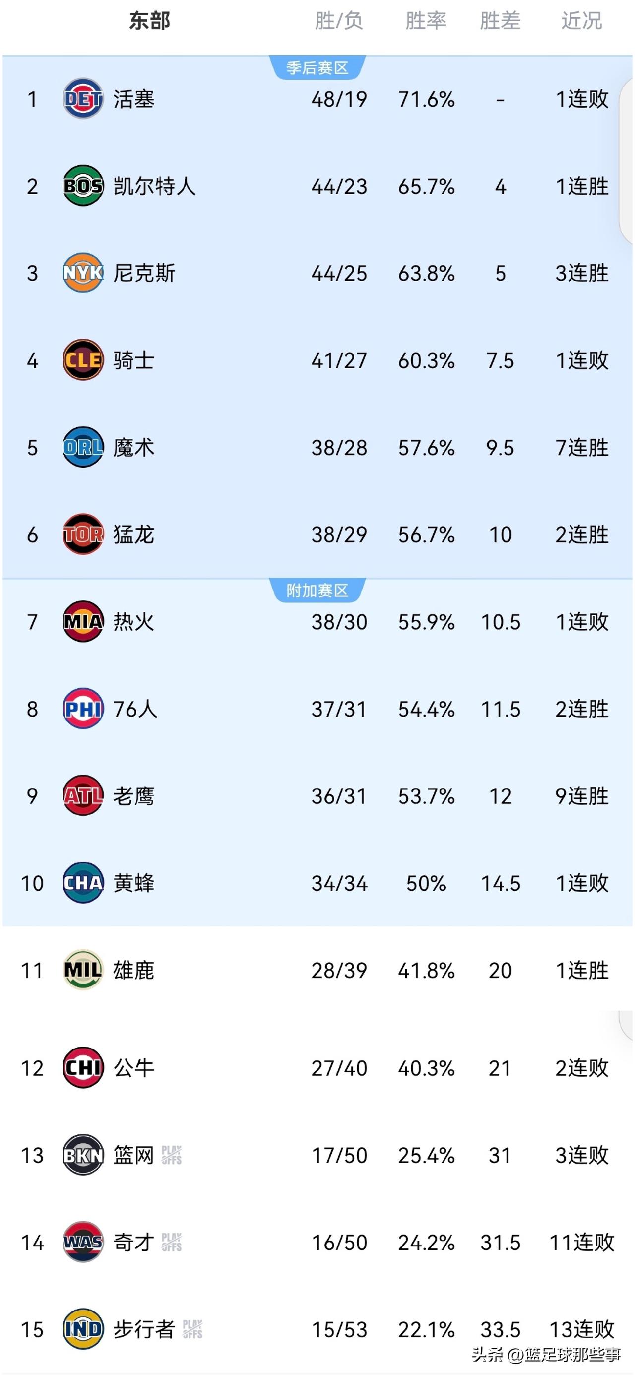 NBA东部最新积分榜: ✅骑士120:130不敌独行侠位列第4,哈登状态不佳12投4中得到13分5板7助出现6次失误,弗拉格、马绍尔和华盛顿均砍下20+得分帮助球队成功复仇; ✅活塞108:119不敌猛龙3连胜遭终结,不过东部第1的位置还是稳固的,猛龙两连胜升至第6;坎宁安、杜伦和哈里斯依旧发挥神勇,难耐以英格拉姆为首的猛龙全面开花; ✅尼克斯110:107击退残阵勇士取得3连胜稳居第3,布伦森30分9助盘活全队,哈特和唐斯均摘下12个篮板球;勇士队打得不错距离胜利一步之遥,桑托斯、波杰姆斯基和波斯特均砍下20+得分; ✅步行者123:134不敌雄鹿惨遭13连败,步行者想要状元签,雄鹿不知道要啥就知道留不住字母哥。