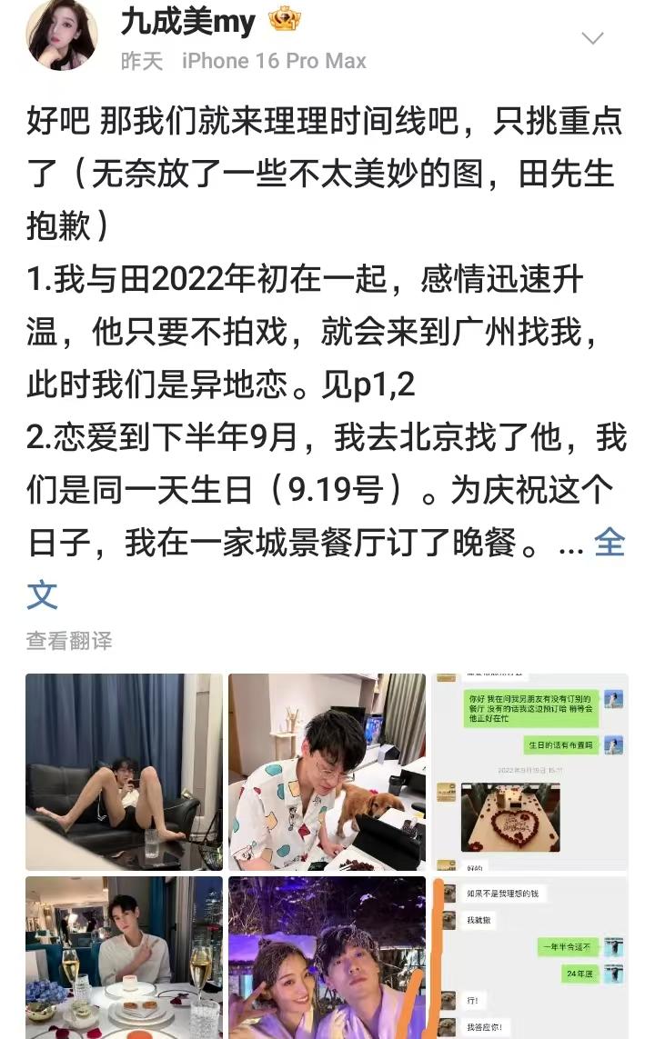 九成美发长文梳理与田栩宁恋爱时间线:愿负法律责任 3月16日,九成美在社交平台发布长文,详细梳理与田栩宁从2022年初至2023年底的恋爱时间线,并配发多张合影、机票、酒店订单等佐证图片。她在文末强调:“内容有任何不符,我愿负法律责任。” 根据九成美自述,时间线如下: 2022年初,两人在一起,开始异地恋。田栩宁不拍戏时会到广州找她。 2022年9月,她赴北京为同一天生日的田栩宁庆生,在某城景餐厅订了晚餐。 2023年初,两人一同去长白山旅游。 2023年中,田栩宁让她搬到杭州,承诺会买房娶她。她带着行李和狗,自驾从广州前往杭州,途经厦门时在海边留影。 到杭州后,她发现田栩宁住处凌乱、缺少家居。田栩宁很快进组,她独自买家具、安电视、量窗帘,“希望他回到家的时候,家是完整的”。 到杭州后她无工作,开始做抖音账号、弹钢琴。直播时只能宣称单身,因为田栩宁不允许公开恋情。她解释婚前不想同居,田栩宁让她住自己家,他去兄弟家住,“毕竟平时呆的时间少,大部分都在组里”。 2023年底,两人感情转淡。她为修复感情,定好机票酒店,提议元旦去哈尔滨旅游。但感情仍无起色。 分手前,她不知道若若已怀孕。她写道:“分手的时候我哭了,他也哭了,我以为是舍不得,原来是愧疚。” 分手后她专注做视频,并呼吁不要打扰她的搭档朋友。 截至3月16日,田栩宁方尚未对九成美此次发布的长文及时间线作出新回应。 你怎么看?评论区聊聊👇