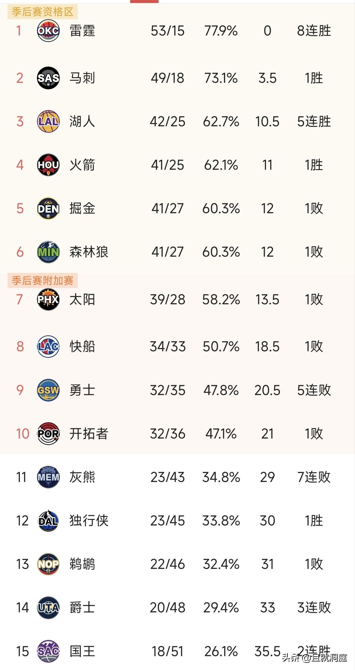 西部倒数两名今天来个“菜鸡互啄”,没想到在威少缺席情况下德罗赞拿到40+10的数据带领国王拿下比赛取得两连胜。 雷霆八连胜继续领跑联盟,亚历山大拿到20+继续延续纪录,他的MVP越来越稳了,如果再拿一个那么现役前十基本上稳了。 勇士又输了,虽然可以拿到附加赛资格,但是快船也不好打呀!西部前六还有很大变数。