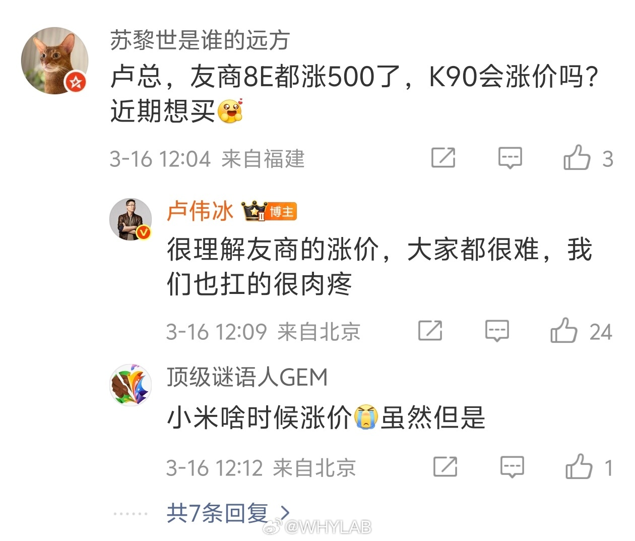 卢总回应 REDMI K90 系列会不会涨价,理解友商,大家都很难,我们也扛的很肉疼。