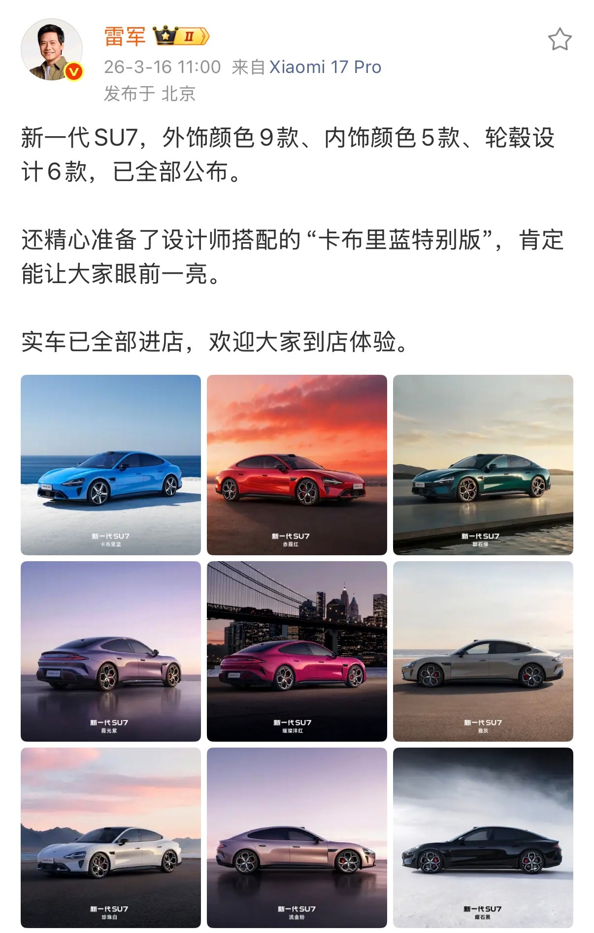 就像雷总说的那样雷军称新SU7是经得起时间考验的好车,老款SU7两年未换代,2025年仍稳居20万以上纯电轿车销量第一,时间与市场双重验证实力,口碑与销量双在线。如今新一代SU7全套9款配色已全部到店,新增卡布里蓝、赤霞红、靛石绿三大专属色,工艺与质感全面越级。