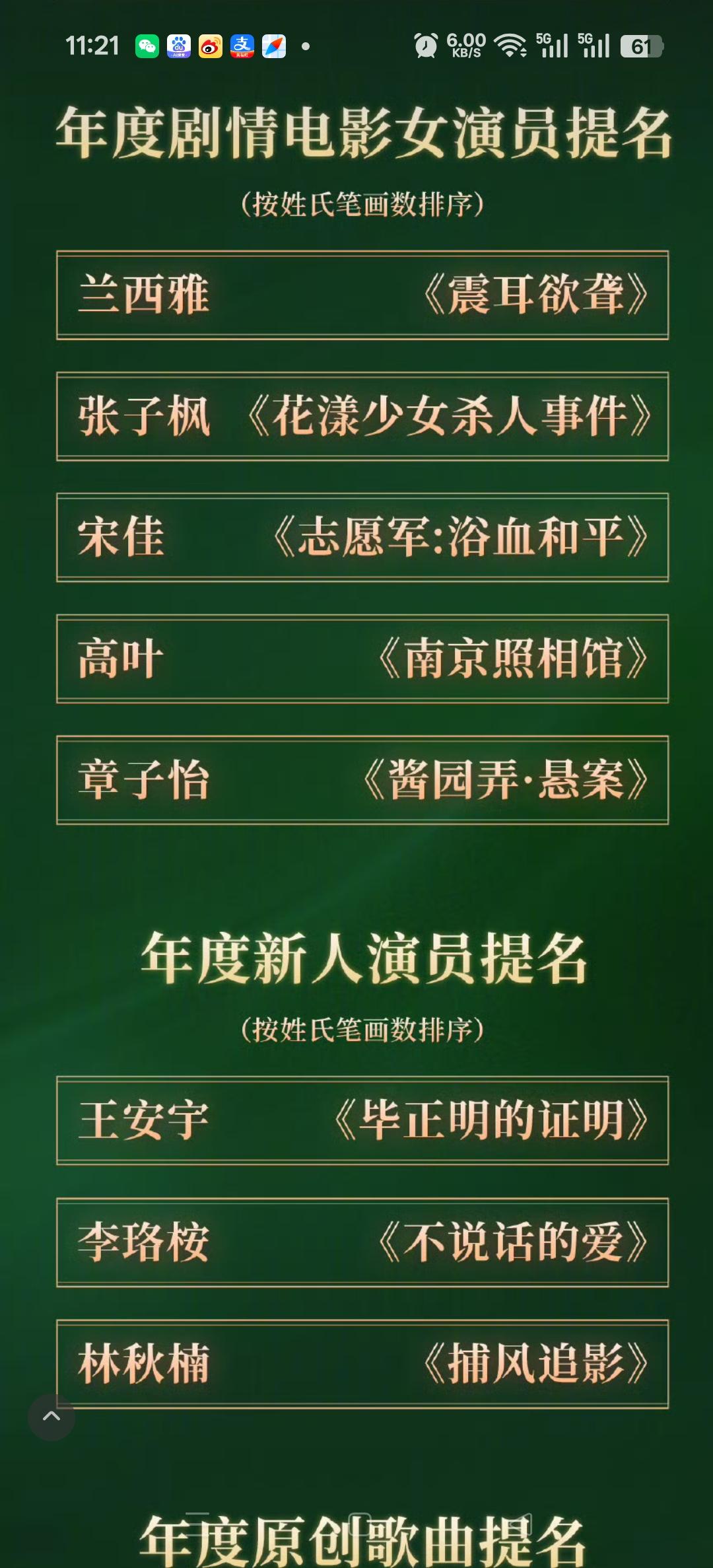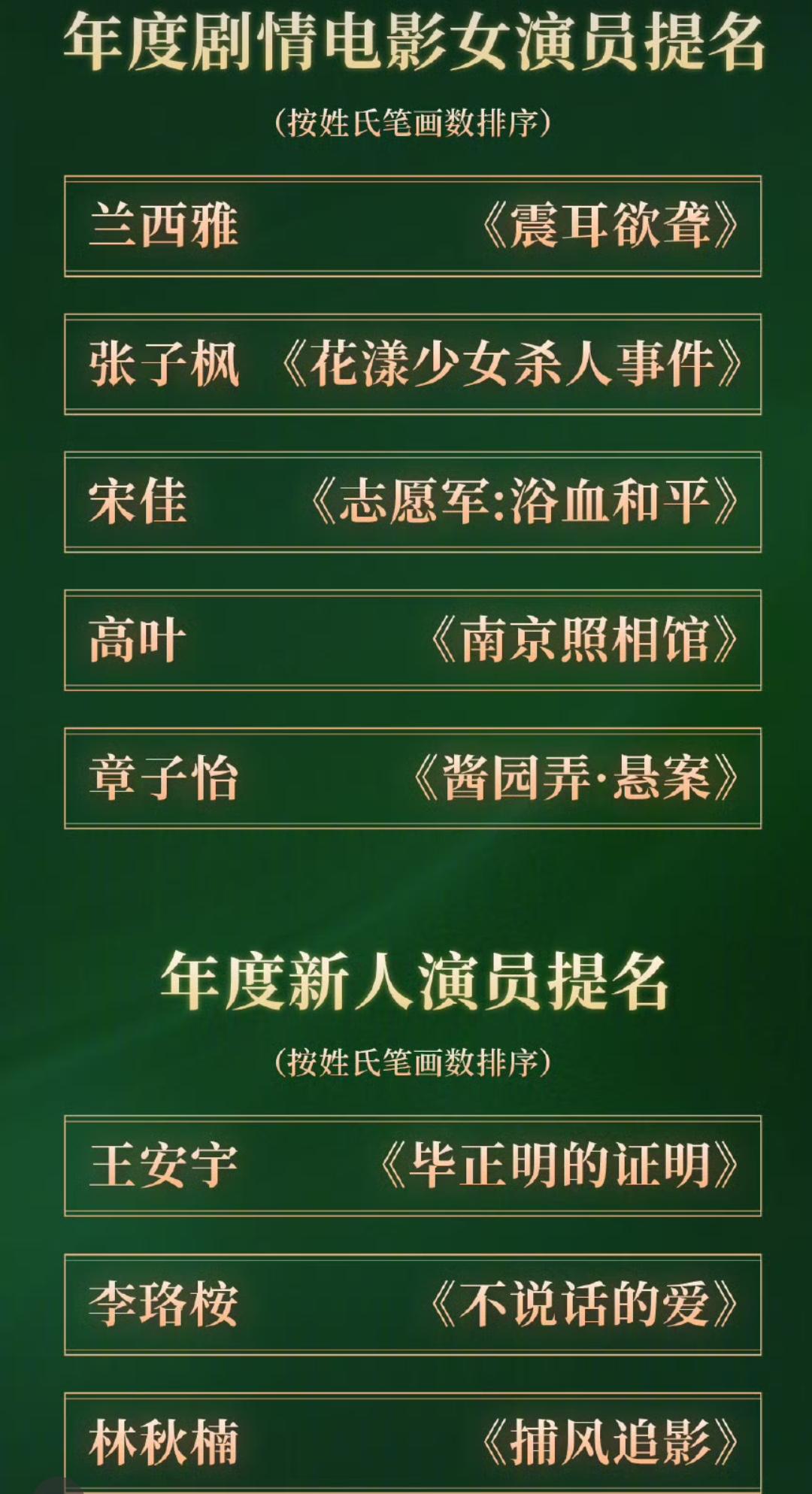 刚看到首届CMG中国电影盛典的提名…对于本次提名,有可惜,有疑问,部分奖项提名匪夷所思。这个社会运行的规则是公平公正,这是电影《震耳欲聋》对我最记忆深刻的一句话,这个名单一出来,我在反思这句话。 年度剧情电影男演员提名: 王传君 《南京照相馆》 朱一龙 《东极岛》 刘昊然《南京照相馆》 肖战 《得闲谨制》 易烊千玺 《狂野时代》 年度剧情电影女演员提名: 兰西雅《震耳欲聋》 张子枫《花漾少女杀人事件》 宋佳《志愿军:浴血和平》 高叶《南京照相馆》 章子怡《酱园弄•悬案》 ​ 辛芷蕾的《日掛中天》论口碑绝对强于提名剧情片女演员的部分电影,论表演也该有一席之地,掉提很奇怪。 本次评选《震耳欲聋》 获得了三个提名! 年度剧情电影提名: 檀健次 《震耳欲聋》年度新人导演提名: 万力 震耳欲聋 年度剧情电影女演员提名: 兰西雅电影 《震耳欲聋》的提名也是很意外,一部剧情合格的电影能拿到多项提名,本是值得祝贺的事。但是意外的是整部作品里戏份最吃重、撑起角色层次感与情绪张力的檀健次,反而连一项提名都没有。 整部电影就是围绕檀健次饰演的李淇展开的,电影和主创都提名了,唯独没有男主,好搞笑!把最具说服力的男主排斥在外,那这个奖项的说服力自然也大打折扣了! 男主檀健次在《震耳欲聋》中的表现是观众有目共睹的,但凡看过这部电影都明白李淇是《震耳欲聋》的灵魂人物,也贡献了最为高光的演技,无数次震撼和感动都是檀健次带来的。 戏内:檀健次对角色的完美诠释、情绪的层层递进、爆发力与克制感都拿捏得恰到好处,无论是眼神戏、细节处理还是人物弧光,都被观众和业内专业人士真切看在眼里,也是影片里最被认可的表演亮点。 戏外:他是高强度跑路演最多、接受采访最多的主创! 电影照进现实。一部取材于真实生活、讲述发声与公平正义的现实主义电影,却在现实世界里完成了它最锋利的一层隐喻——原来,最黑色的幽默,从来不在电影里,而在电影之外。