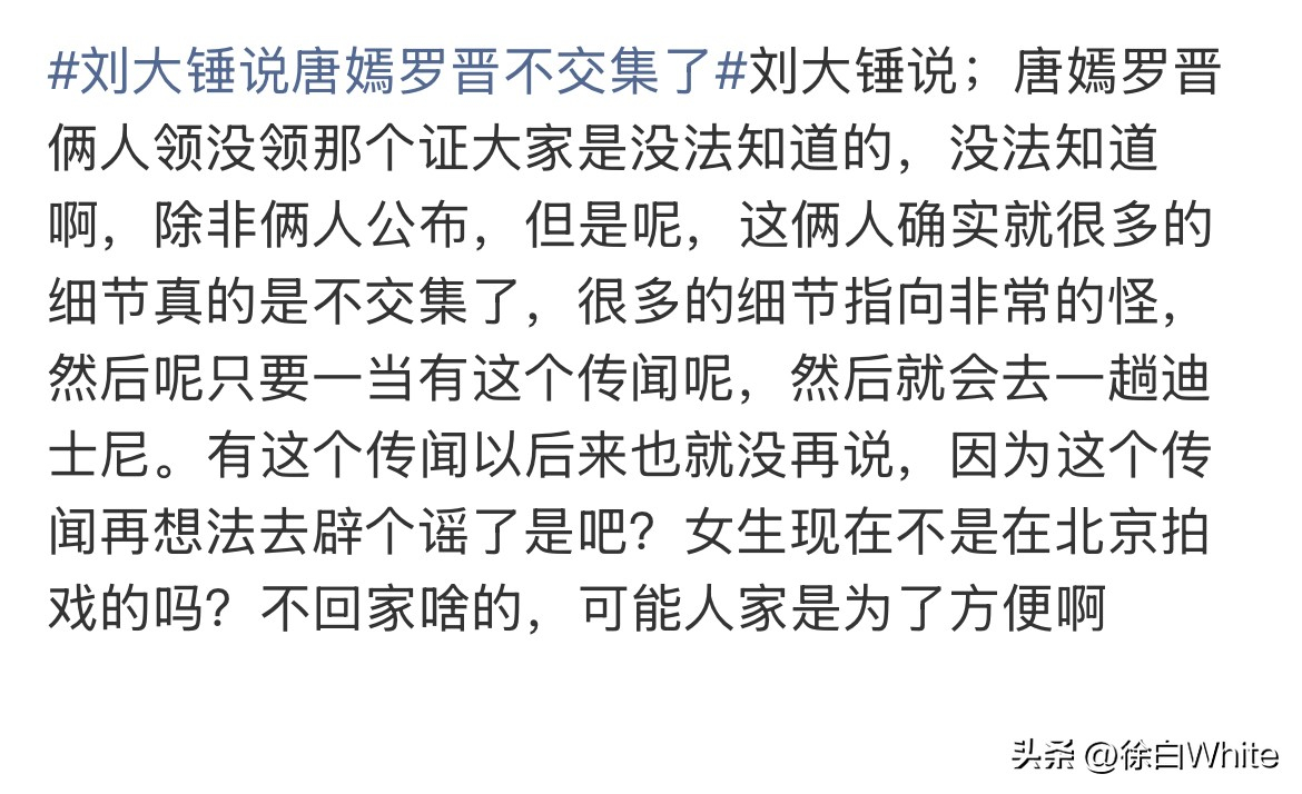唐嫣罗晋又上热搜了!娱记分享唐嫣罗晋不交集,称唐嫣在北京也不回家,与罗晋之间很多细节很怪,我想说唐嫣是在北京工作,不是在北京休息!演员进组住剧组拍摄的住所不是很正常么,与其花几小时上下班,不如就近方便休息!娱记只说唐嫣不回家,说不定罗晋去找唐嫣呢,毕竟罗晋目前在家休息,找唐嫣更加的方便,讲真与其盯着他们的生活,不如盯着他们的作品,唐嫣目前在拍的《此刻的生活》接近尾声,可以期待一波!