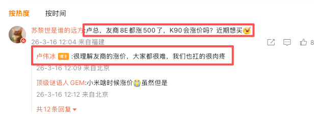 小米集团总裁卢伟冰公开回应:理解友商决策,但小米扛得也很肉疼,并明确 Redmi K90系列暂不涨价,以最大诚意守护用户体验。