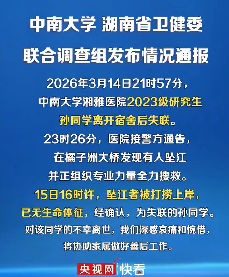 湘雅女研究生孙同学,坠江身亡,2023级研究生,今年研三,正常22岁大学毕业,也就25岁左右,人生最美好芳华,突然凋零,就这么意外走完一生,怎么能让人不痛心!看长相气质,文静漂亮知性,父母、家人养育这么大,培养一个研究生不容易,现在该多悲痛! 网传疑似留有遗书,为了他人相处不好,付出自己生命,太不值得了!悲剧再次警示每一名年轻人,人生挫折难免,除了生死,都是小事,拿的起放得下,是每一个人幸福人生的必修课!通报说将依法依规彻查,希望给孙同学一个告慰!给家人一个交代!
