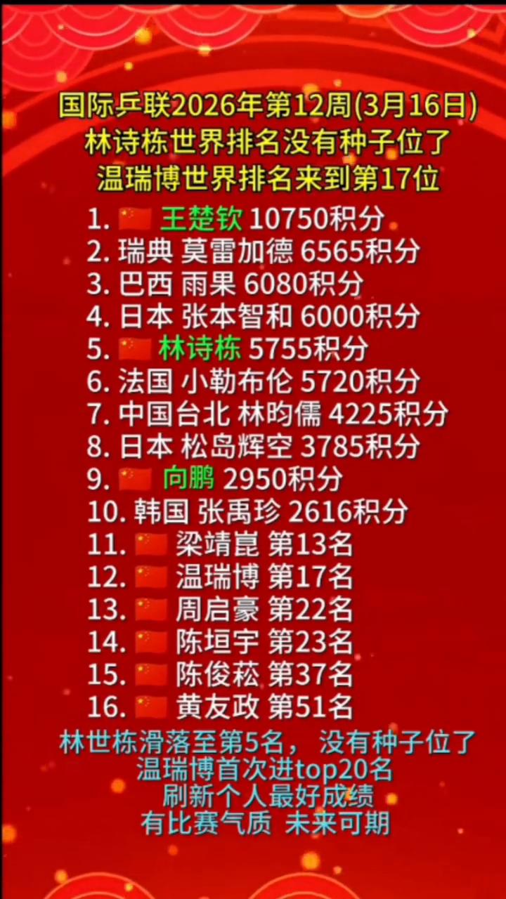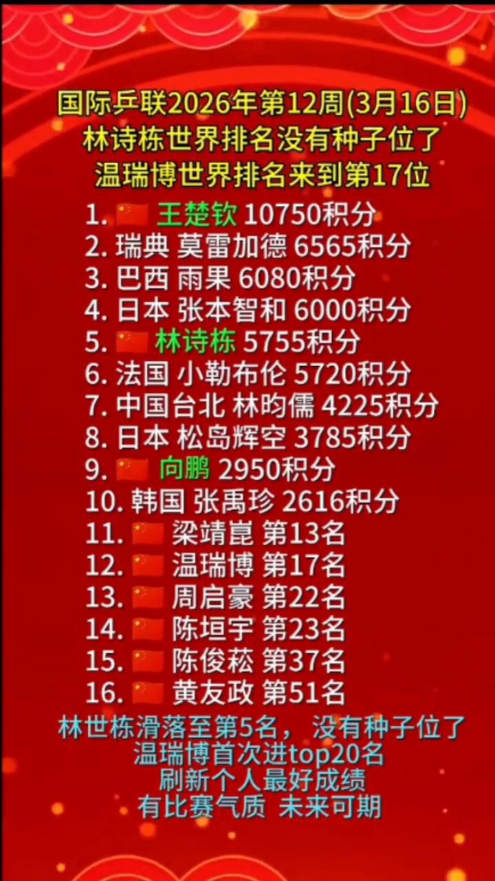 ·14.陈垣宇第23名。 ·15.陈俊菘第37名。 ·16.林世栋滑落至第5名,没有种子位了。温瑞博首次进top20名刷新个人最好成绩,有比赛气质未来可期。 国际乒联2026年第12周(3月16日)林诗栋世界排名没有种子位了。温瑞博世界排名来到第17位。 1.王楚钦10750积分。 2.瑞典莫雷加德6565积分。 3.巴西雨果6080积分。 4.日本张本智和6000积分。 5.林诗栋5755积分。 6.法国小勒布伦5720积分。 7.中国台北林昀儒4225积分。 8.日本松岛辉空3785积分。 9.向鹏2950积分。 10.韩国张禹珍2616积分。 11.梁靖昆第13名。 12.温瑞博第17名。 13.周启豪第22名。 14.陈垣宇第23名。 15.陈俊菘第37名。 16.黄友政第51名。 17.林世栋滑落至第5名,没有种子位了。温瑞博首次进top20名刷新个人最好成绩,有比赛气质未来可期。 国际乒联2026年第12周(3月16日)林诗栋世界排名没有种子位了。温瑞博世界排名来到第17位。 1.王楚钦10750积分。 2.瑞典莫雷加德6565积分。 3.巴西雨果6080积分。 4.日本张本智和6000积分。 5.林诗栋5755积分。 6.法国小勒布伦5720积分。 7.中国台北林昀儒4225积分。 8.日本松岛辉空3785积分。 9.向鹏2950积分。 10.韩国张禹珍2616积分。 11.梁靖昆第13名。 12.温瑞博第17名。 13.周启豪第22名。 14.黄友政第51名。 16.黄友政第51名。 黄友政第49名。