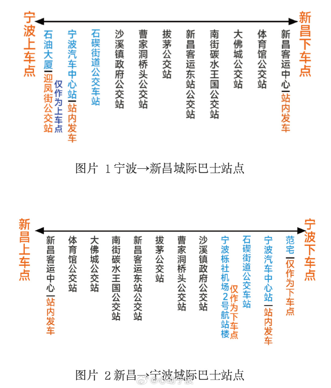 宁波往返新昌城际巴士上线 3月19日,宁波⇌新昌“浙客行·城际巴士”将试运行,由宁波公运等联合打造,沿途设10站,宁波始发站为鼓楼前石油大厦迎凤街公交站,初期每日往返各4班。试运营单程票价29.9元,提前一日以上购票可享19.9元优惠,全程一票制。新昌至宁波车次停靠栎社机场2号航站楼,方便乘机旅客。(甬派)