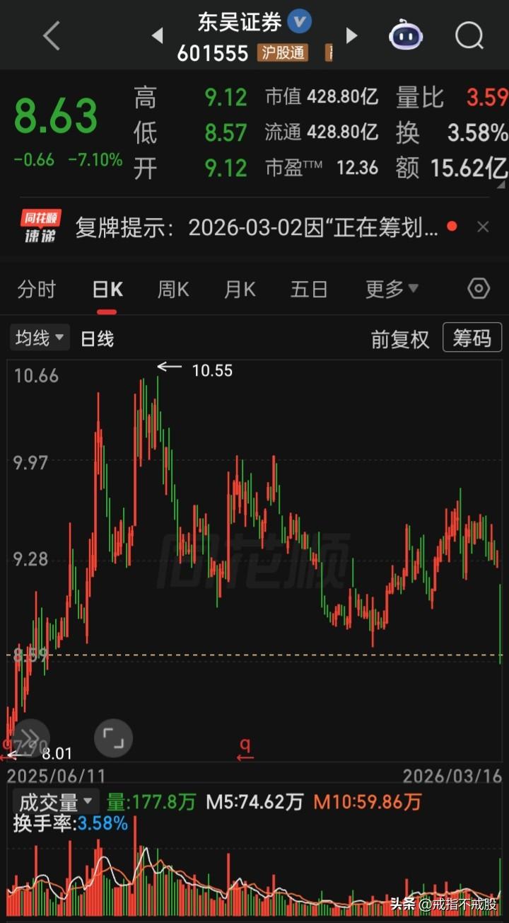 拿着此货的想想都郁闷 停牌10个交易日,拟东海证券83.77%的股份,想想怎么都得一个板,至少是高开低走吧 好不容易等到今天开盘,结果直接用脚投票,直接低开“水下潜”跌了7.10% 证券碰不得,再好的也不碰,你说呢?