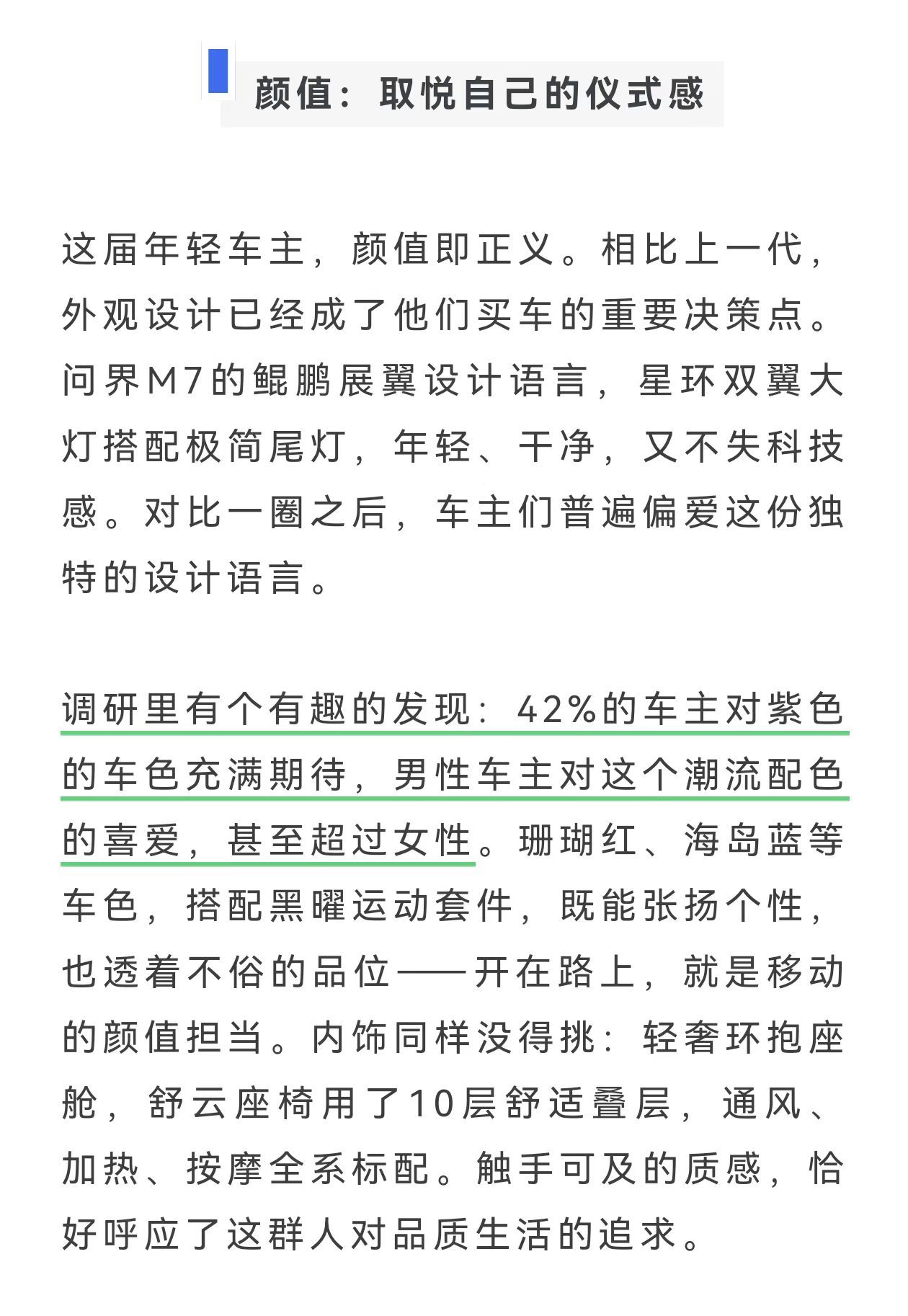 从“随大流最安全”到我选我喜欢,买车先取悦自己。夜紫不张扬、不浮夸,只是不想被人海淹没。问界M7用一抹高级紫,回应当代人最真实的悦己需求。问界M7官宣夜紫新色问界M7新车色亮相