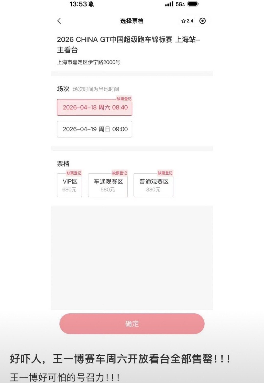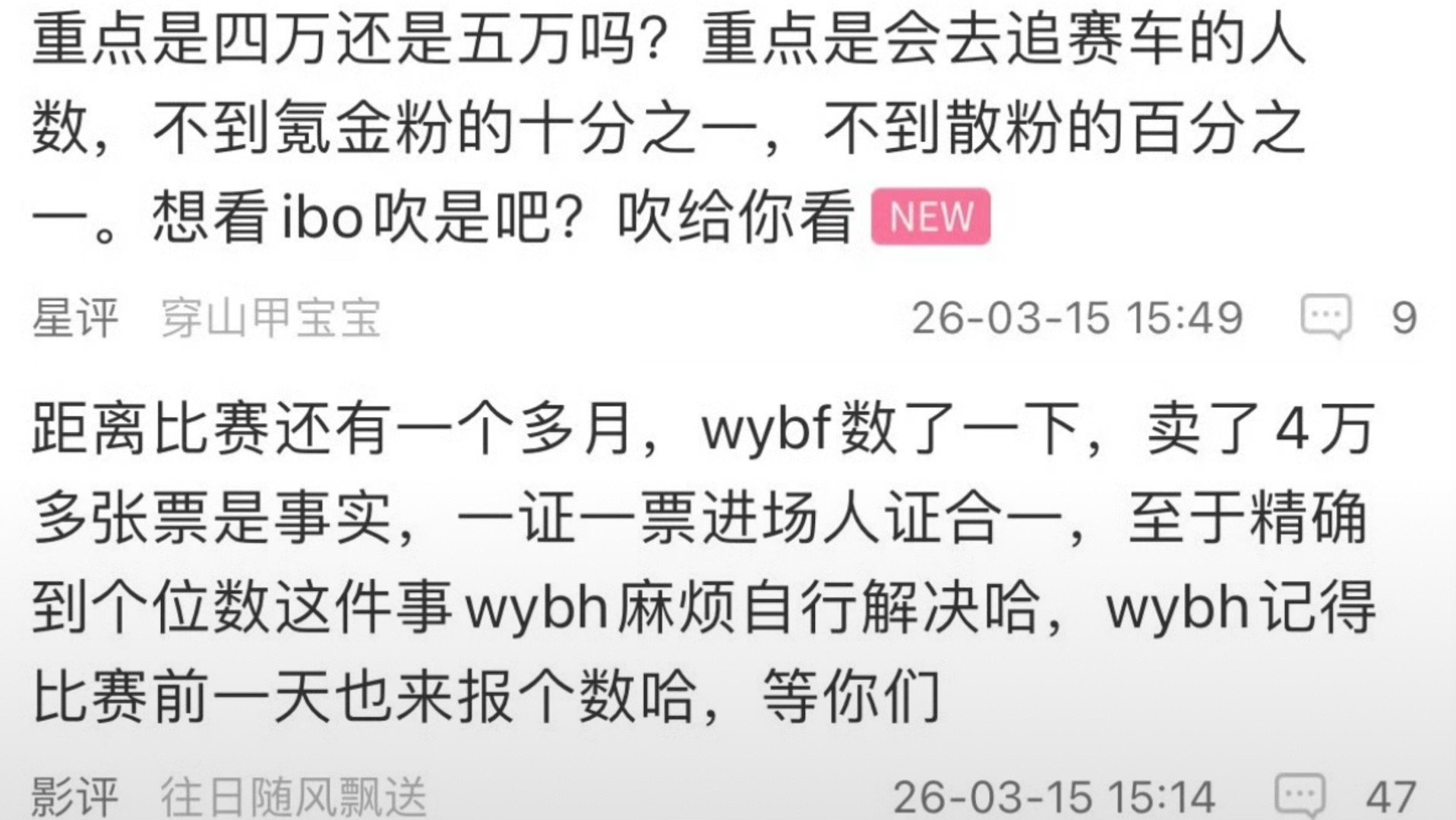 王一博的赛车票提前一个多月已经售出4万多张。一人一证一票。而会去看赛车的不到氪金粉的十分之一,不到散粉的百分之一❗谁懂这是什么概念~