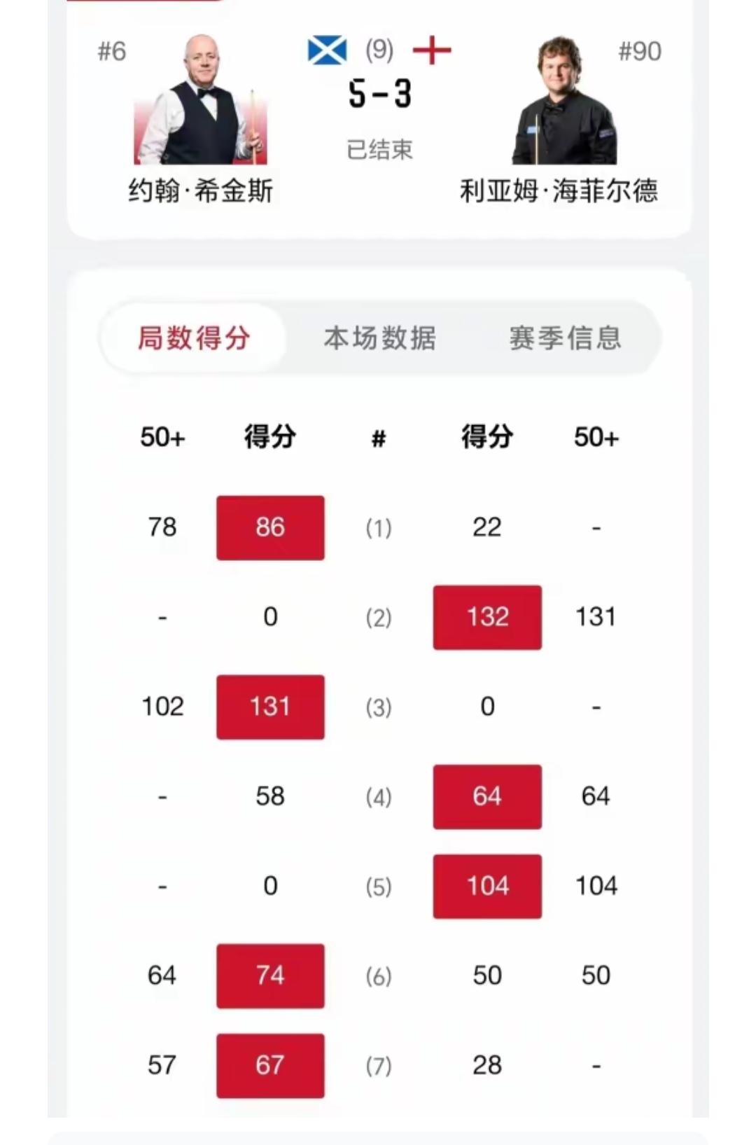 宝刀不老!希金斯揭幕战一波三连鞭5-3逆转战胜利亚姆海菲尔德 北京时间斯诺克玉山公开赛揭幕战,七五三杰之一的希金斯迎战利亚姆海菲尔德。比赛精彩纷呈,最终卫冕冠军希金斯棋高一筹。凭借一杆破百和3杆50+,战胜轰出两杆破百打出两杆50+的利亚姆海菲尔德,比赛过程如下: 第一局,希金斯凭借单杆78分,86:22先拔头筹,取得开门红。 第二局,海菲尔德轰出单杆131分破百,132:0扳平局分。 第三局,希金斯还以颜色,轰出单杆102分破百,131:0获胜。 第四局,海菲尔德凭借单杆64分,64:58单局逆转获胜,双方战成2-2平,进入中间休息。 第五局,海菲尔德轰出单杆104分破百,零封希金斯。连赢两局反超局分3-2领先。 第六局,尽管海菲尔德打出单杆50分,但是希金斯凭借单杆64分,74:50扳平局分。 第七局,希金斯延续良好的手感,凭借单杆57分,67:28再下一局,反超局分4-3领先,率先拿到赛点。 第八局,希金斯凭借零敲碎打得分,75:0收割比赛。最终卫冕冠军希金斯凭借一波三连鞭逆转战胜利亚姆海菲尔德,晋级下一轮。玉山斯诺克比赛 希金斯的球速