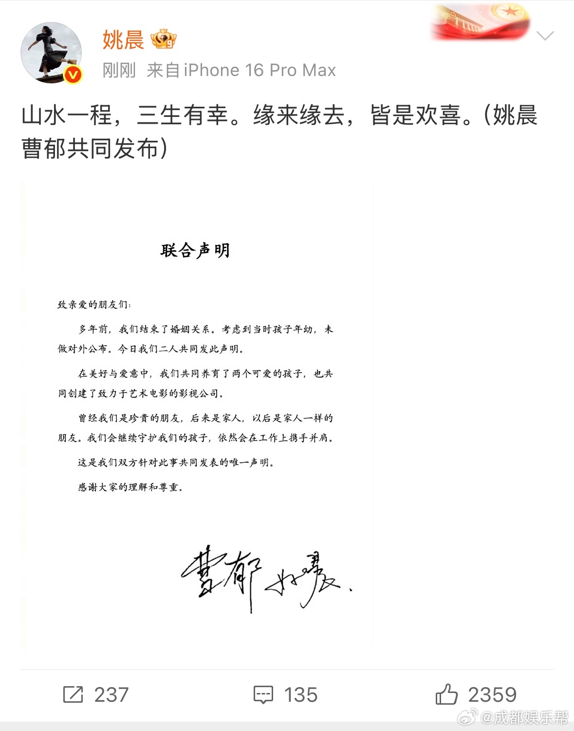 姚晨离婚姚晨曹郁官宣离婚 刚刚,姚晨和曹郁发布联合声明官宣离婚:“多年前,我们结束了婚姻关系,考虑到当时孩子年幼,并未对外公布。”姚晨官宣离婚