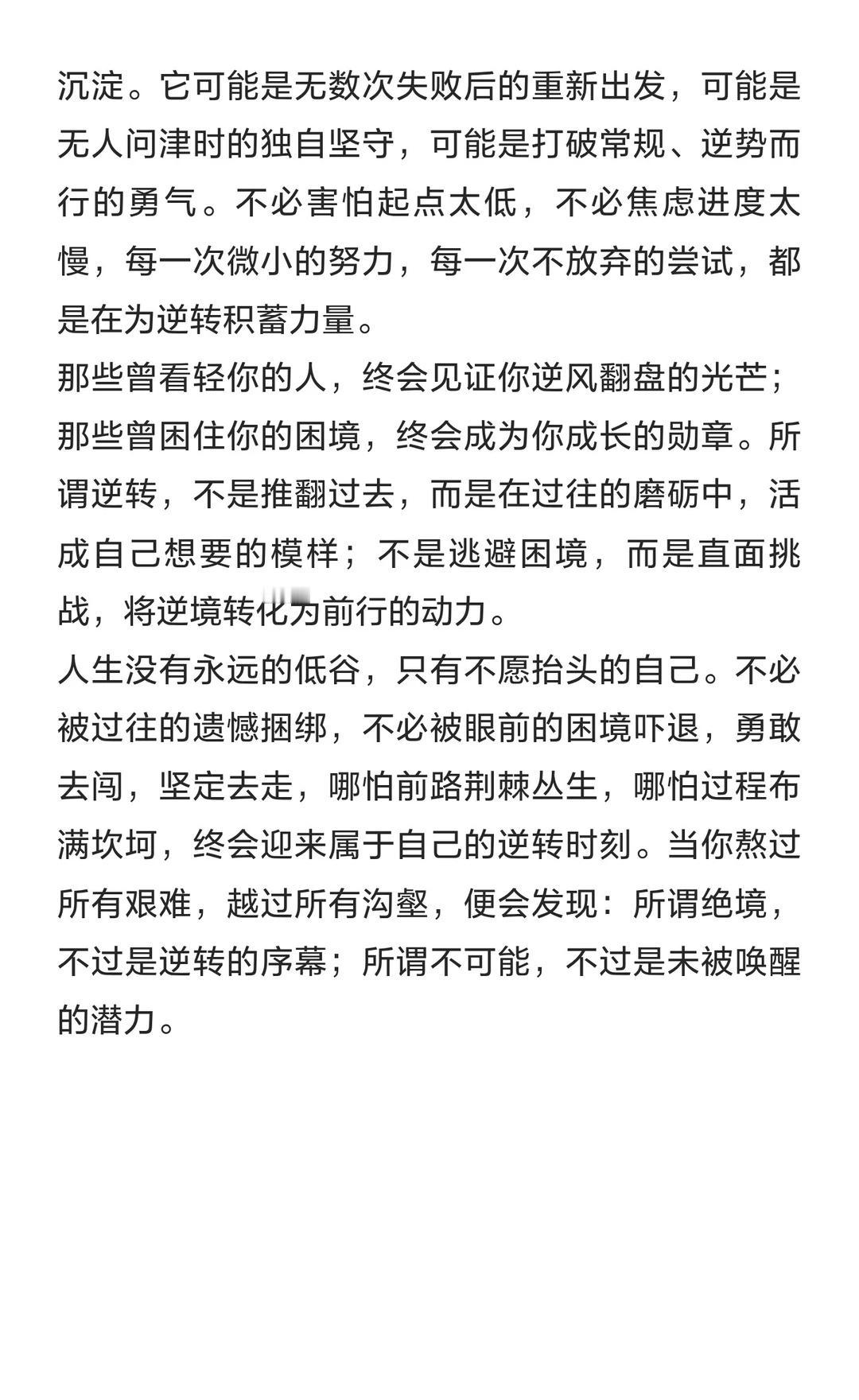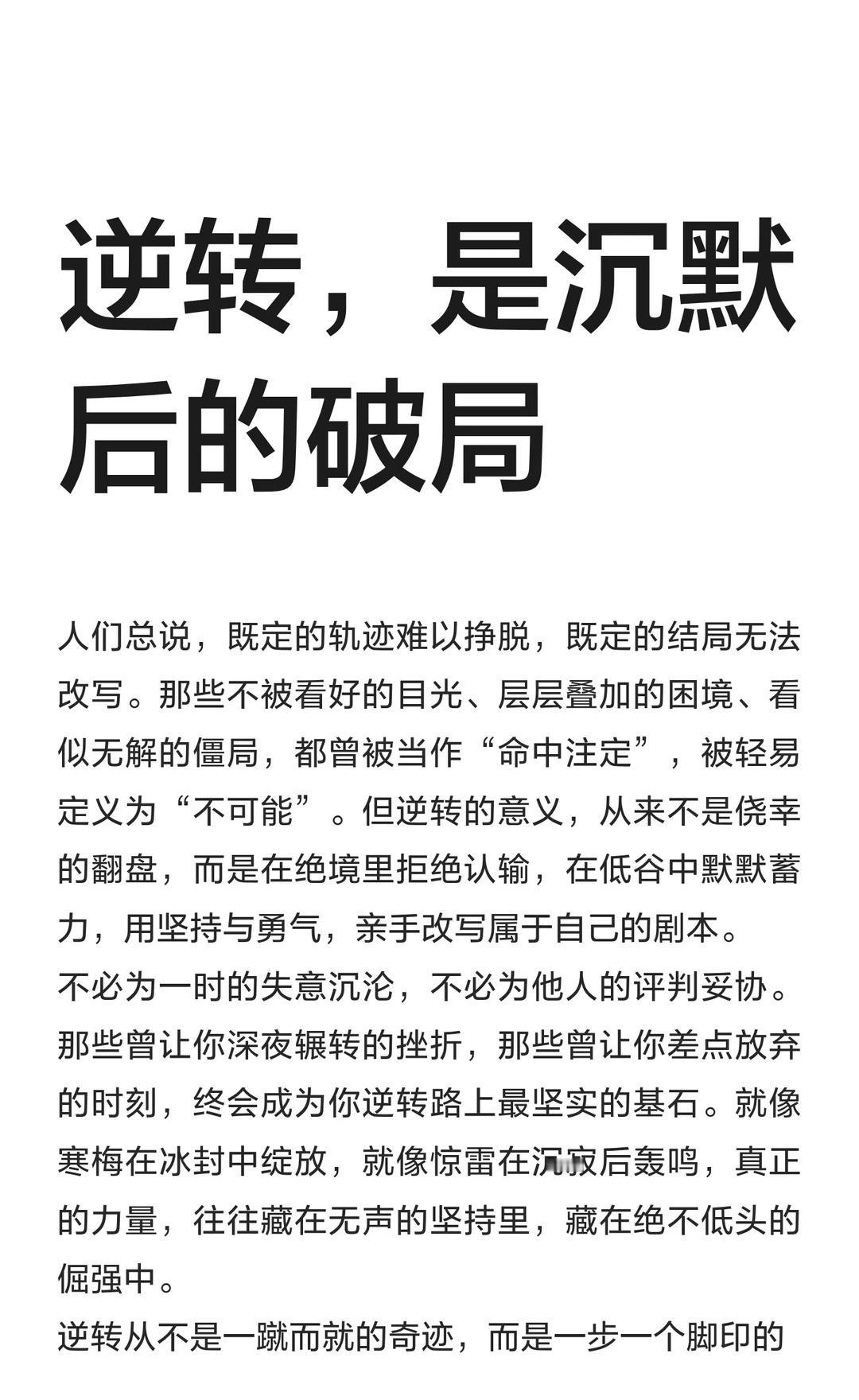 逆转,是沉默后的破局 不必被过往的遗憾捆绑,不必被眼前的困境吓退,勇敢去闯,坚定去走,哪怕前路荆棘丛生,哪怕过程布满坎坷,终会迎来属于自己的逆转时刻
