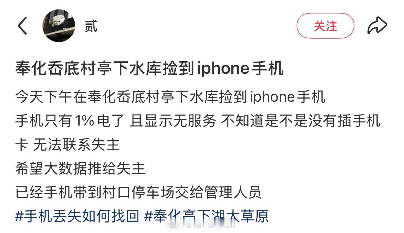 今天下午在奉化岙底村亭下水库捡到iphone手机手机只有1%电了 且显示无服务 不知道是不是没有插手机卡 无法联系失主希望大数据推给失主已经手机带到村口停车场交给管理人员