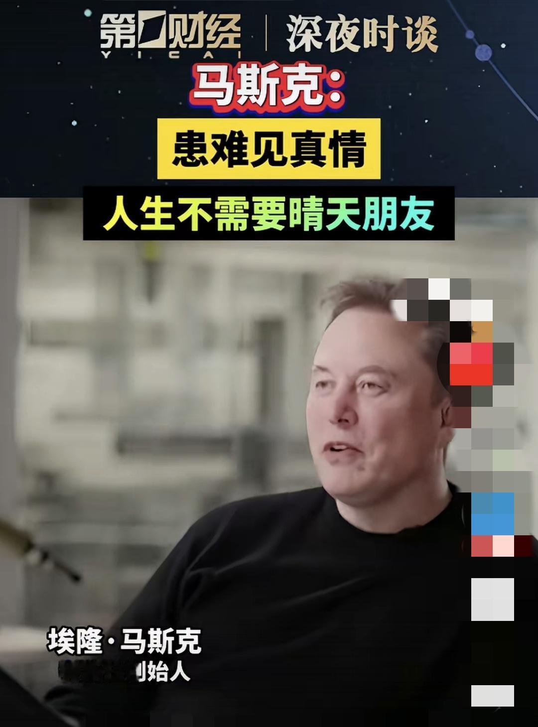 马斯克是很有钱, 一个人的财富可以抵好多个国家总合! 所以很多人把她的话当成真理 但其实。他未必活的比你快活! 患难见真情得确如此 我们朋友的数量不在多,要精 晴天朋友也要相处 因为往往等患难的时候没有朋友 马斯克是不会缺朋友的 但他也在删选取舍 所以才会有这样的言论 每个人境遇经历不同 作为普通人, 如果晴天朋友在我落难时 不帮忙我也不记恨他 毕竟他没有这个义务 人性都是自保的 无私无畏的人毕竟少 首先你要能这么对待他人 才能收获同频的朋友