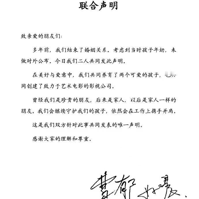姚晨曹郁官宣离婚!14年婚姻体面落幕,隐离多年只为护娃 3月16日15时35分,姚晨和曹郁同时发了一条微博,直接冲上热搜榜首—— “多年前,我们结束了婚姻关系。考虑到当时孩子年幼,未做对外公布。” 2012年新西兰完婚,2013年生儿子小土豆,2016年生女儿小茉莉,14年婚姻,原来早就悄悄画上了句号。 网友炸了:隐离这么多年?完全没发现! 声明写得极尽体面:“曾经我们是珍贵的朋友,后来是家人,以后是家人一样的朋友。我们会继续守护我们的孩子,依然会在工作上携手并肩。” 没有撕扯,没有指责,没有财产纠纷,一句“山水一程,三生有幸”封神。 回看这几年,两人确实还在公开互动——2025年6月曹郁当选奥斯卡评委,姚晨发文“恭喜曹老师!”,妻子口吻自然;电影节红毯照走,家庭合照照发,谁能想到早就离了? 隐离原因声明里也说了:孩子年幼。小土豆现在12岁,小茉莉9岁,终于等到孩子们有了心理承受能力,才选择公布。 网友感慨:这才是成年人该有的体面。 但也有人翻出姚晨上一段婚姻——2011年和凌潇肃离婚时,可是闹得满城风雨。对比两段婚姻的结局,确实天差地别。 还有人在猜:是不是有一方要再婚了,才不得不官宣?但毫无实证,纯属脑补。 最扎心的是狗仔被群嘲:隐离这么多年都没拍到,业务能力堪忧啊。 热搜挂了半天,评论区清一色好评。“体面落幕”“成熟范本”“为护娃隐离多年”——娱乐圈离婚声明的新天花板,诞生了。 只是那句“多年前”,到底是几年前?大概只有他们自己知道了。