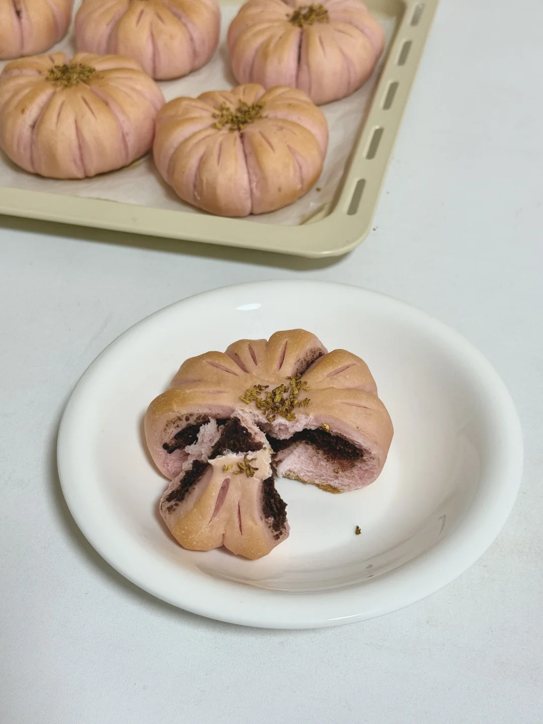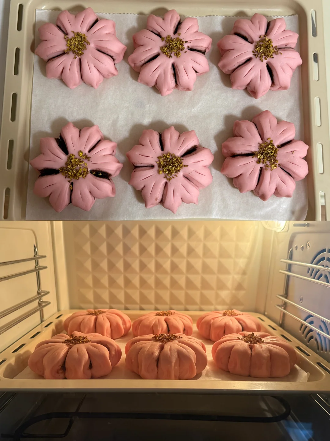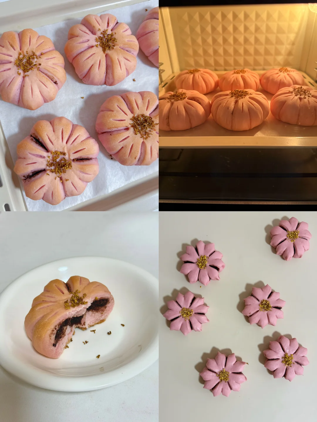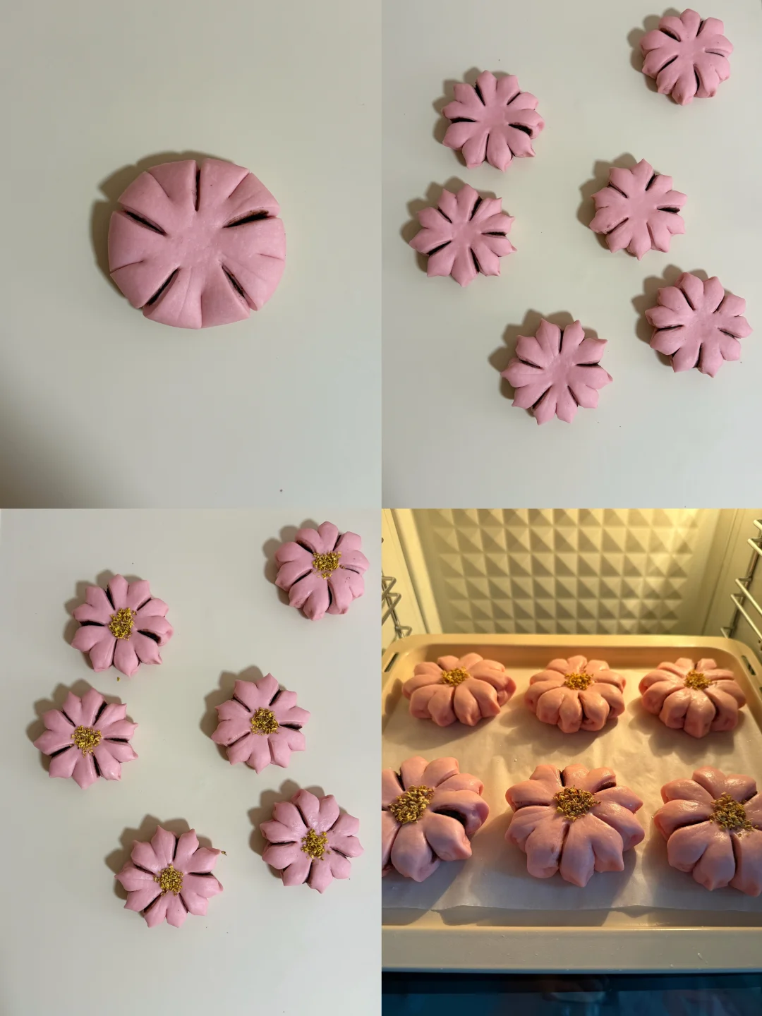 又是一年樱花季,我把超美的樱花做成了面包,既美丽又美味😋 🌸主面团: 高筋面粉240克 低筋粉40克 牛奶170克 干酵母3克 细砂糖20克 盐2.5克 黄油25克 仙人掌果粉1克 内陷:市售红豆沙 表面装饰:干桂花 🔥烘烤温度参考 平炉烤箱180°C 15分钟 为避免表面上色可在7 8分钟左右的时候加盖锡纸