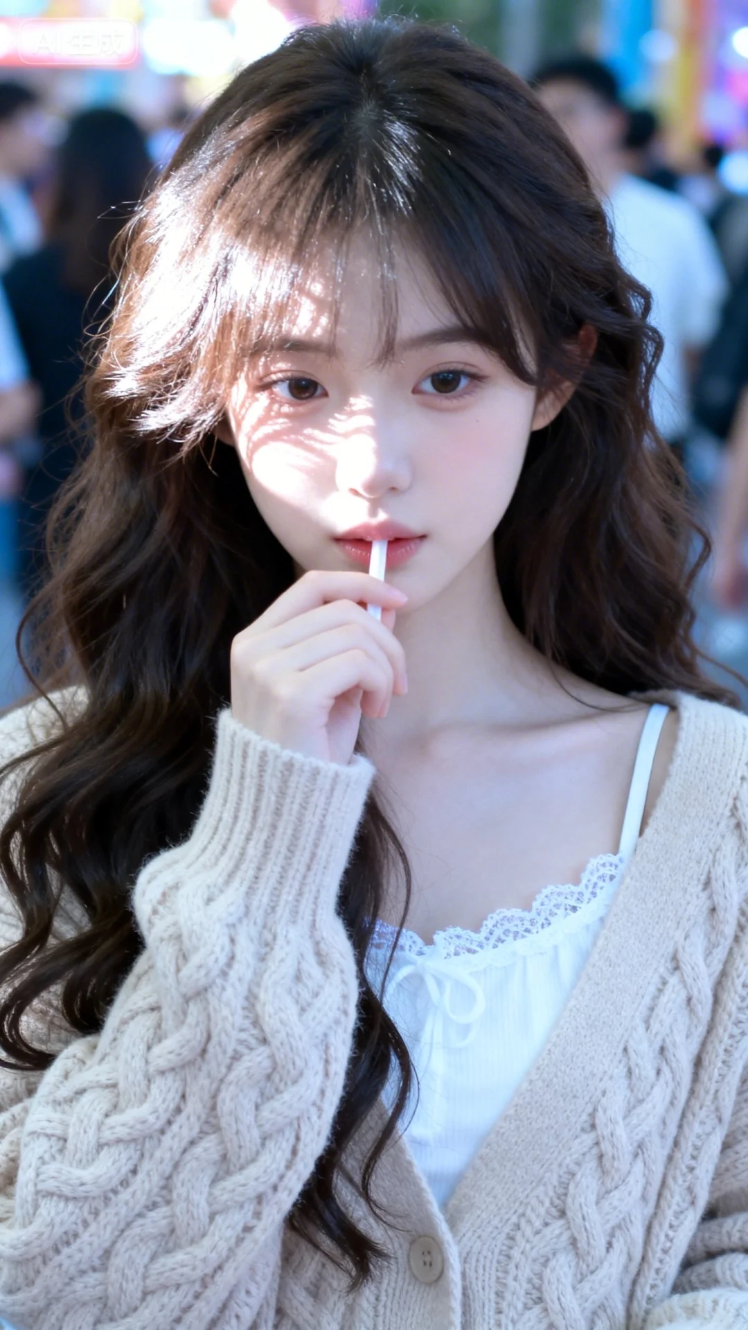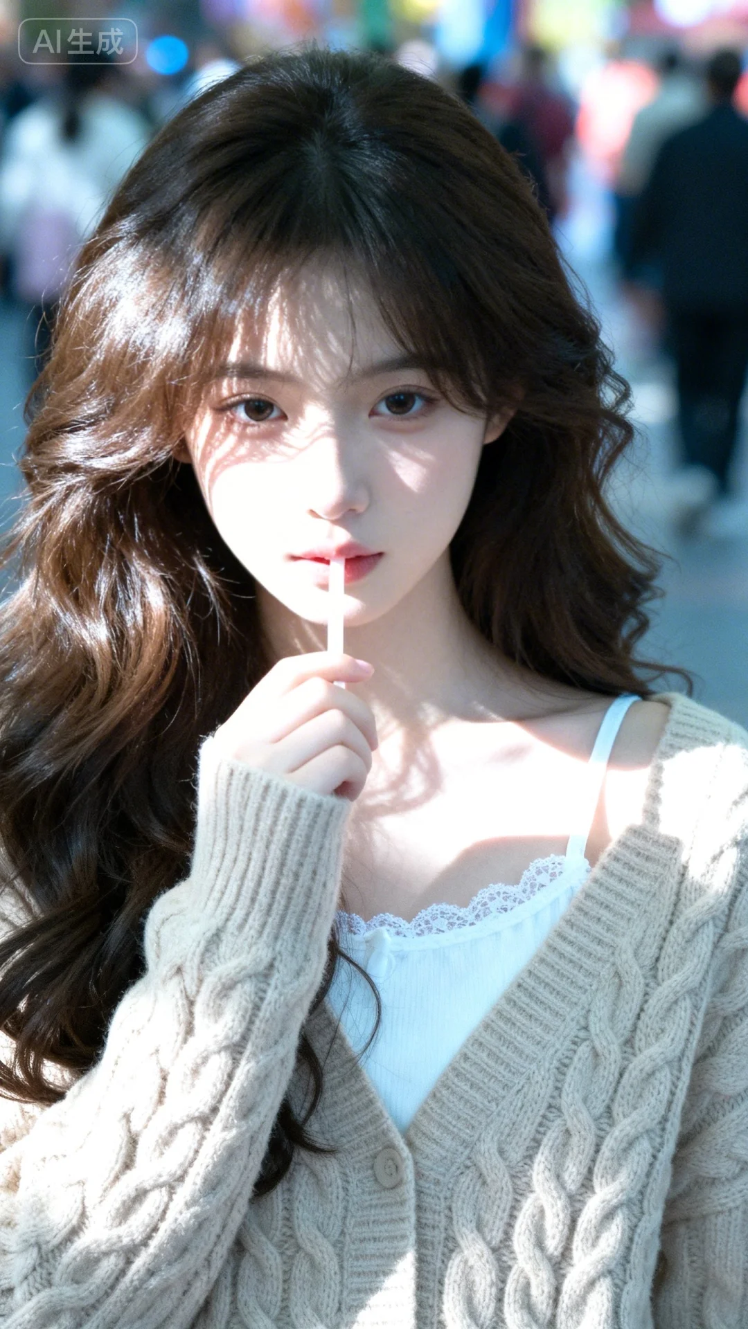 图片风格为“曦梦”,梦幻朦胧感。街边奶茶店外,一位深棕长卷发的女生,模样洋娃娃般可爱,冷白皮。她身穿浅杏色绞花针织开衫,内搭白色蕾丝边吊带,开衫的软糯质感和清晰层次在柔和光线下尤为突出。 画面氛围:一张CCD拍摄质感的抓拍,因快门速度不足产生轻微运动模糊,构图随意自然。阳光透过深棕发丝在她脸上投下光斑,肌肤通透自然。她正低头咬着吸管,眼神温柔看向镜头,表情自然松弛。背景有虚化的行人,营造生活化的绚丽日常。保留轻微噪点,高光不过曝,阴影有细节,大师级氛围作品。
