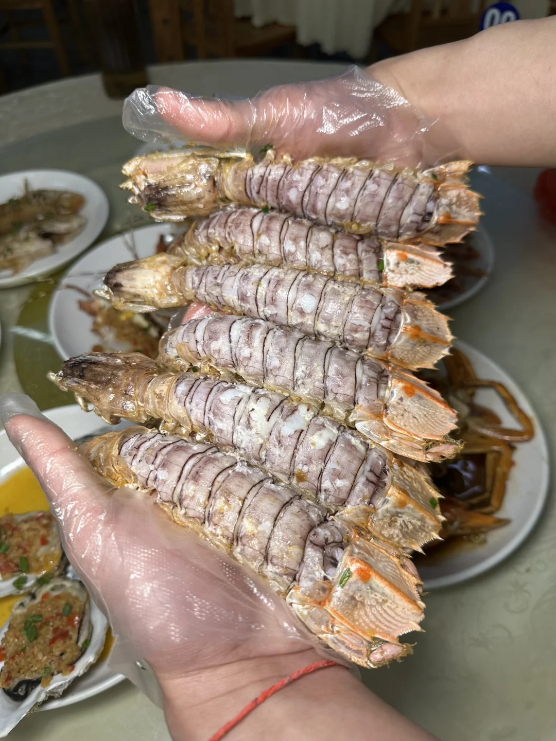 [偷笑R]我们买了7种海鲜,带膏大皮皮虾105一斤、青蟹65一斤、樱花虾37一斤、小青龙105两只、沙虫55一斤、红色不知名的鱼18一斤、本地生蚝4块一个,一共是400多点