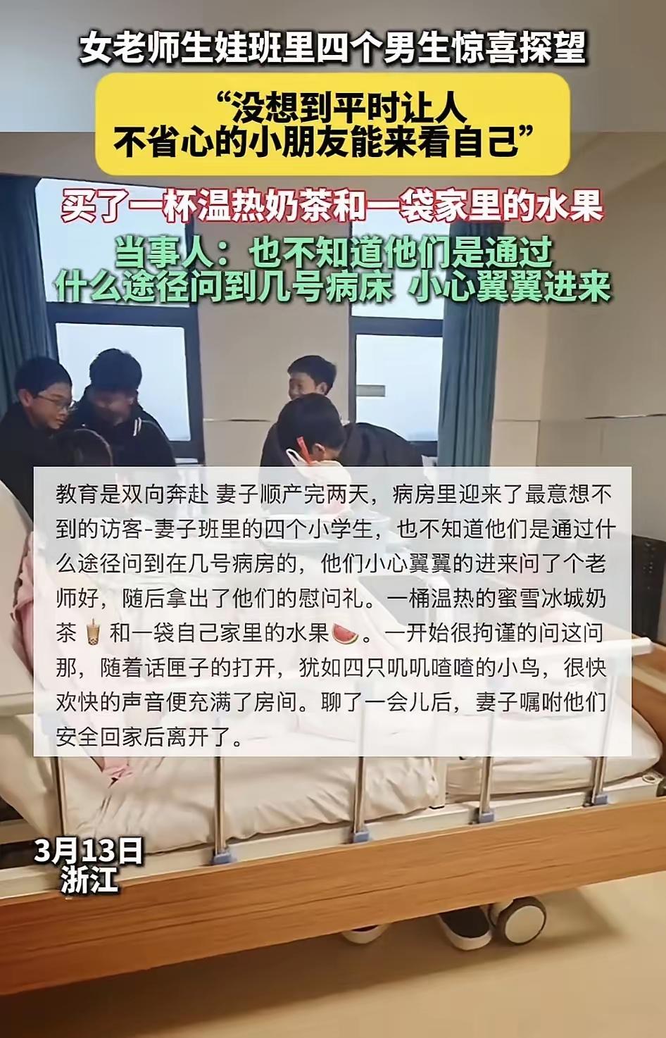 浙江女老师住院,4 个“刺头”男生竟摸到医院!看到他们手里的东西,全网破防了! 万万没想到,最让老师头疼的“四大金刚”,竟然成了病房里最暖的那束光。 在浙江的一家医院里,发生了一幕让无数人泪目的场景。一位刚生产完的女老师正躺在病床上休养,身心俱疲之际,病房门突然被轻轻推开。令她惊掉下巴的是,站在门口的竟然是班里出了名调皮捣蛋的四个男生! 这四个孩子,平日里可是让这位老师没少操心。上课接话茬、下课满走廊跑、作业写得龙飞凤舞……他们是办公室里的“常客”,也是老师恨铁不成钢的重点关注对象。老师怎么也想不到,自己从未特意交代过生病的事,这几个平时让她“不省心”的孩子,竟然自发组织起来,一路打听到了医院,只为来看她一眼。 那一刻,所有的疲惫都化作了眼眶中的热泪。 更让人破防的细节还在后面。这四个大男孩并没有空手而来,他们手里捧着的,不是昂贵的鲜花,也不是精美的礼盒,而是一杯还冒着热气的温奶茶,以及一大袋沉甸甸的自家种的水果和蔬菜。 孩子们有些局促地站在床边,小声说道:“老师,听说您生小宝宝了,我们想来看看您。这是我家刚摘的菜和水果,特别甜;这杯奶茶您趁热喝,别凉了。” 看着眼前这些平日里总是惹自己生气的面孔,此刻却显得如此懂事、如此细腻,女老师心中的感动难以言表。她原本以为,只有那些成绩优异、乖巧听话的学生才会记得恩师,却未曾料到,恰恰是这些看似“顽劣”的孩子,用最朴实无华的方式,给了她最大的惊喜。 这一幕迅速在网络上传开,引发了千万网友的共鸣与热议。 有人感慨道:“真是这样!学校里那些最难管的孩子,往往长大后最懂人情世故。他们或许不擅长考试,但他们拥有一颗滚烫的心。多年后,真正还记得并回来看望老师的,往往就是这群孩子。” 另一位网友分享了自己的亲身经历,让人动容:“我家孩子当年也是全校闻名的‘捣蛋鬼’,没少给老师惹麻烦。如今他已步入社会,但每年过年,他第一个想到的就是给小学班主任发拜年信息。他说,虽然那时候总挨批,但他知道老师是真的为他好。一名好老师,真的能被孩子记一辈子!” 的确,成绩只能代表过去的一时,而人品和感恩之心,才是一个人行走世间最宝贵的财富。 这几个孩子的举动,狠狠地给当下的“唯分数论”上了一课。在他们身上,我们看到了比满分试卷更珍贵的东西——那是一颗懂得感恩、懂得回馈的赤子之心。此时此刻,成绩的好坏真的不再重要,重要的是这份双向奔赴的师生情谊,温暖了整个寒冬。 孩子们虽然调皮,但他们心里跟明镜似的。谁是真的对他们好,谁是真心为他们负责,他们比谁都清楚。这位女老师平日里虽然严厉,虽然没少批评教育他们,但那份藏在严厉背后的关爱与责任,孩子们全都接收到了。 正如网友所言:“感情都是双向奔赴的。”如果不是老师平日里真心实意地对待每一个孩子,哪怕是所谓的“差生”,又怎能换来孩子们如此自发的探望?这四个孩子能准确找到医院,能想到带温热的奶茶和自家的农产品,说明他们在私下里不仅讨论了老师的病情,更把老师的喜好和需求放在了心上。这才是教育最美的样子。 教育不仅仅是知识的灌输,更是灵魂的唤醒。这位女老师用她的责任心,唤醒了孩子们内心深处的善良与感恩;而孩子们用他们纯真的行动,回报了老师的付出,也让老师感受到了作为教师最大的成就感。 这一杯温热的奶茶,这一袋带着泥土芬芳的蔬菜,价值或许不高,但在老师心中,它们胜过任何金银珠宝。因为它们承载着四个孩子最纯粹的敬意与爱戴。 这件事也给我们所有家长和教育者提了个醒:请不要轻易放弃任何一个“调皮”的孩子。他们或许现在让你头疼,或许成绩不尽如人意,但他们内心深处同样藏着巨大的能量和温情。只要用真心去浇灌,用爱去引导,终有一天,他们会以你意想不到的方式,绽放出最耀眼的光芒。 为这位有爱的女老师点赞,更为这四个懂事得让人心疼的孩子点赞!愿这份温暖的师生情,能治愈更多人的心,愿每一个孩子都能在爱与被爱中茁壮成长。 对此,你怎么看?你身边有这样的“调皮但暖心”的学生吗?欢迎在评论区留言分享你的故事!刺儿头学生 教师背刺