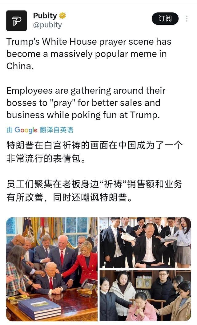 美国人也关注到:“特朗普在白宫祈祷的画面在中国成为了一个非常流行的表情包” 美国与伊朗紧张关系升级后,特朗普于2020年1月在白宫椭圆形办公室召集多名基督教牧师进行集体祈祷活动,这一举动旨在寻求精神支持,应对中东局势动荡。照片显示多名牧师围拢特朗普,进行手搭肩头的祈祷仪式,白宫官员通过社交媒体发布相关视频,强调为军队和国家寻求指引。这样的宗教表达在美国政治中常见,尤其在危机时期,用于凝聚保守派选民支持。 事件发生时,美国主流媒体如CNN和Fox News报道了这一祈祷会,焦点放在特朗普的外交策略与信仰结合上,一些评论员指出这体现了美国领导人在国际冲突中的传统应对方式。中国网民很快捕捉到这一图像,通过社交平台如微博和抖音将其转化为表情包形式,用于日常职场调侃。 这个表情包趋势从2020年初迅速兴起,中国用户将原照片修改为办公室场景,老板取代特朗普位置,员工模仿牧师姿势,祈求公司业绩提升或奖金增加。这种改编反映了普通人面对工作压力的自嘲心态,视频版本在抖音等平台累计播放量达数亿次。 国际媒体注意到这一现象,路透社和BBC等报道了跨文化传播的趣味性,美国观察者认为这体现了全球网络时代下政治图像的再利用方式。中国企业员工参与模仿,形成一种社交挑战,扩展到学校和家庭场景,但核心仍是原白宫祈祷的集体姿势。这样的传播不限于娱乐,还隐含对权力依赖的观察,美国部分媒体如The Atlantic在后续文章中讨论了这一国际反馈对特朗普形象的影响。