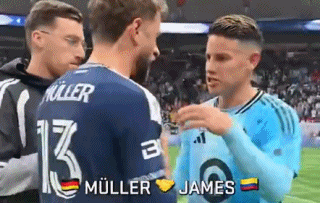 此次两人在美职联赛场相逢,穆勒依然不忘搞怪本性,不过J罗看上去兴致不高。这倒可以理解,因为他所在的明尼苏达联本场比赛0-6惨败于穆勒所在的温哥华白浪。拜仁慕尼黑美职联