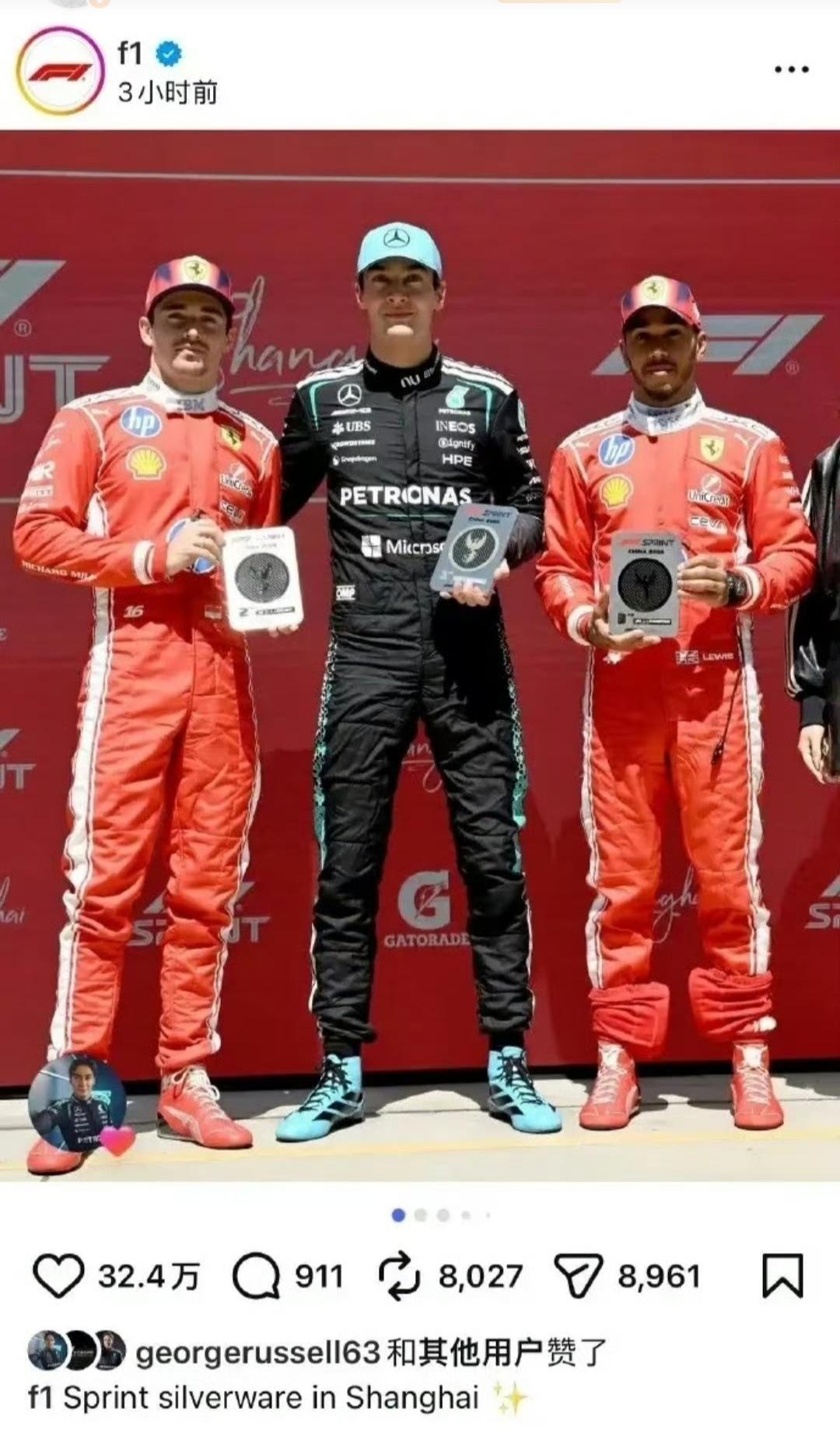 真的要被某些媒体的离谱操作整笑了! F1官方海外账号发了上海站冲刺赛前三名的领奖