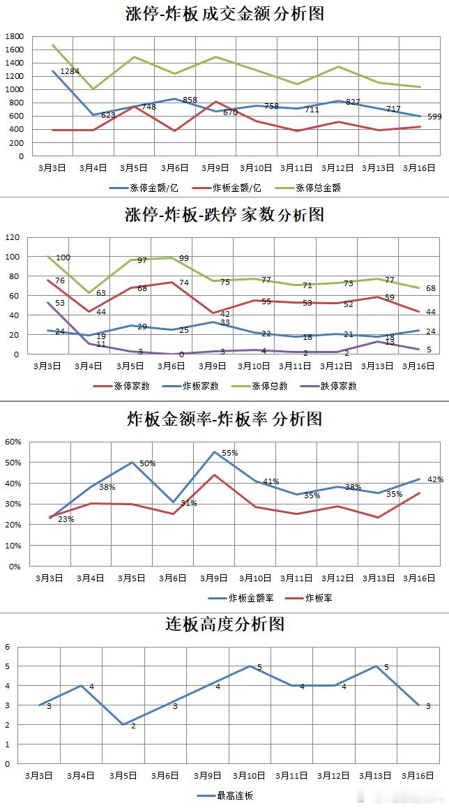 【3.16星期一】 湖南人涨停复盘 "涨停金额:599亿 炸板金额:436亿首板金额:530亿 连板金额:69亿涨停44家 炸板24家 跌停5家首板38家 连板6家" 【市场连板股】6只 69亿 代码 名称 末次时间 连板数 原因600370 三房巷 9:30 3 化工000890 法尔胜 14:55 3 光通信600683 京投发展 9:34 2 公告603929 亚翔集成 10:15 2 国产芯片600227 赤天化 14:43 2 化工603248 锡华科技 14:47 2 风电【存储芯片】5只 195亿 消息面:存储短缺问题或持续至2027年下半年 300042 朗科科技 10:29 1 存储产品000620 盈新发展 11:20 1 收购长兴半导体60%股权600667 太极实业 11:24 1 DRAM封测300606 金太阳 13:28 1 存算一体芯片603986 兆易创新 13:36 1 存储芯片【海洋经济】4只 13亿 消息面:《求是》杂志发表文章《推动海洋经济高质量发展》 002086 东方海洋 9:25 1 海洋生态养殖002427 尤夫股份 9:34 1 海工装备002278 神开股份 9:35 1 海工装备(石油钻采)002724 海洋王 9:36 1 海上平台照明【机器人】4只 6亿 消息面:特斯拉3月或发布新款机器人 600302 标准股份 9:32 1 机械臂3D机器人缝纫001278 一彬科技 9:44 1 间接投资机器人000020 深华发A 9:49 1 液晶显示+机器人002990 盛视科技 10:09 1 人形机器人【AI应用】3只 31亿 002467 二六三 10:09 1 OpenClaw002995 天地在线 13:08 1 AI营销002235 安妮股份 14:21 1 AI版权【AI硬件】3只 27亿 600545 卓郎智能 10:33 1 玻璃纤维纱线设备603175 超颖电子 14:13 1 AI服务器PCB002831 裕同科技 14:55 1/4天2板 液冷【储能】3只 34亿 600152 维科技术 10:04 1 钠离子电池+储能603778 国晟科技 10:26 1/4天2板 储能+钙钛矿光伏组件300051 琏升科技 14:43 1 储能+太空光伏【电力】3只 48亿 600396 华电辽能 9:25 1 海上风电000533 顺钠股份 10:13 1/9天5板 数据中心(变压器)603421 鼎信通讯 11:01 1/5天3板 智能电网【光通信】3只 32亿 000890 法尔胜 14:55 3/16天9板 光通信+储能002980 华盛昌 13:17 1 拟收购伽蓝特603738 泰晶科技 13:18 1 625MHz晶振【化工】3只 32亿 600370 三房巷 9:30 3 瓶级聚酯切片600227 赤天化 14:43 2/7天4板 甲醇605366 宏柏新材 13:01 1 含硫硅烷偶联剂(有机硅)【其他热点】 603248 锡华科技 14:47 2 风电002310 东方新能 14:11 1 风电603929 亚翔集成 10:15 2 国产芯片+半导体洁净室603052 可川科技 13:57 1 国产芯片+硅光芯片600751 海航科技 10:32 1 航运+远洋运输601975 招商南油 13:30 1 航运+油气运输002426 胜利精密 10:54 1 铜箔002636 金安国纪 10:56 1 铜箔000639 西王食品 9:59 1 菜籽油涨价600313 农发种业 10:49 1 菜籽油涨价【其他个股】 600683 京投发展 9:34 2 剥离地产业务605299 舒华体育 10:01 1 大消费000617 中油资本 11:09 1 跨境支付【涨停炸板】24只 436亿 代码 名称 首次时间 涨跌幅 原因300209 行云科技 14:23 20.04% 其他301099 雅创电子 13:59 20.00% 存储芯片300961 深水海纳 9:32 15.38% 海洋经济001309 德明利 13:40 10.00% 闪存600337 美克家居 9:52 9.02% 大消费600722 金牛化工 9:35 8.62% 化工600367 红星发展 11:16 8.10% 美伊战争002537 海联金汇 9:30 7.36% 美伊战争000798 中水渔业 9:31 7.27% 海洋经济002342 巨力索具 9:37 7.26% 航天603516 淳中科技 10:16 6.76% AI硬件600996 贵广网络 10:00 6.40% 东数西算/算力600470 六国化工 9:35 6.21% 化工002960 青鸟消防 9:30 6.19% 消防002069 獐子岛 9:30 6.04% 水产养殖000420 吉林化纤 9:38 5.81% 碳纤维000995 皇台酒业 9:56 5.55% 大消费601218 吉鑫科技 9:46 3.89% 风电603897 长城科技 9:30 3.73% 机器人000545 金浦钛业 9:36 3.55% 化工000912 泸天化 9:33 1.66% 化工002470 金正大 9:30 1.55% 化工600691 潞化科技 9:36 -3.16% 甲醇001366 播恩集团 9:25 -7.99% 美伊战争