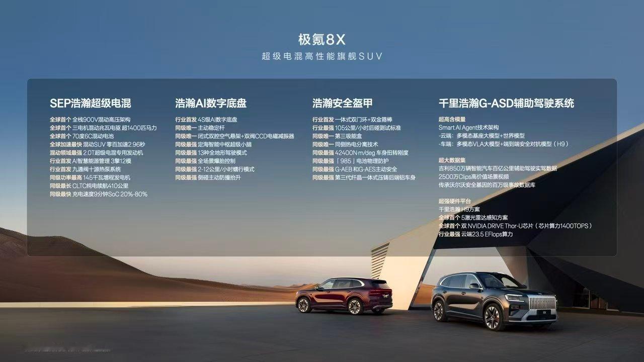 既能掌控绝对的速度,也能驾驭极致的温度高性能不为大空间让路安全基因底色守护每一程千里浩瀚G-ASD智享全路况这就是极氪8X新公路之王极氪8X 极氪8X曜影