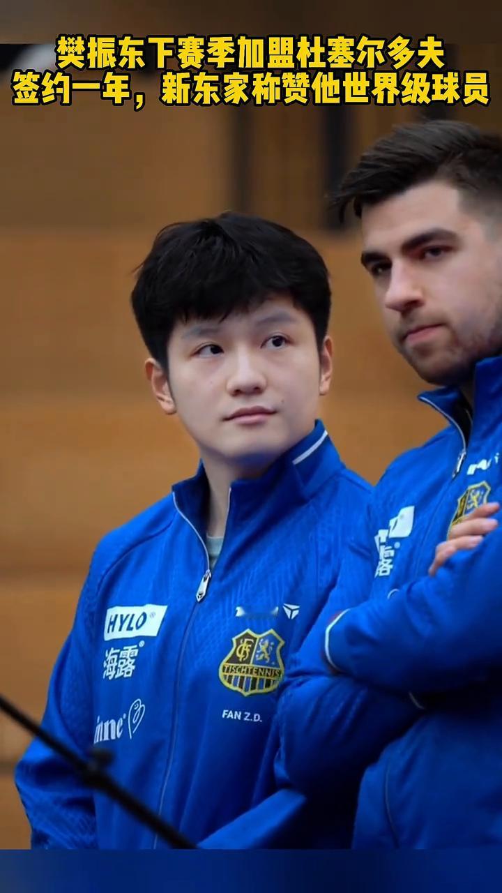 樊振东下赛季加盟杜塞尔多夫,签约一年,新东家称赞他世界级球员。 官宣樊振东将在下赛季继续征战德甲、乒乓球甲级联赛,转会加盟杜塞尔多夫俱乐部,签约一年合同。杜瑟经理更新合影,配文:欢迎樊振东加盟杜塞尔多夫,称赞他是世界级球星和杰出的体育人物。