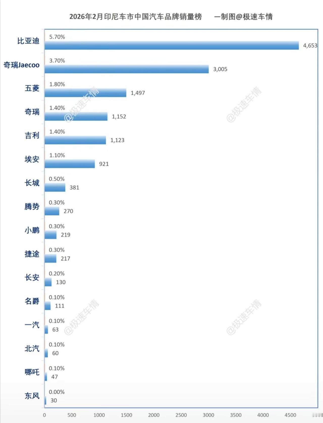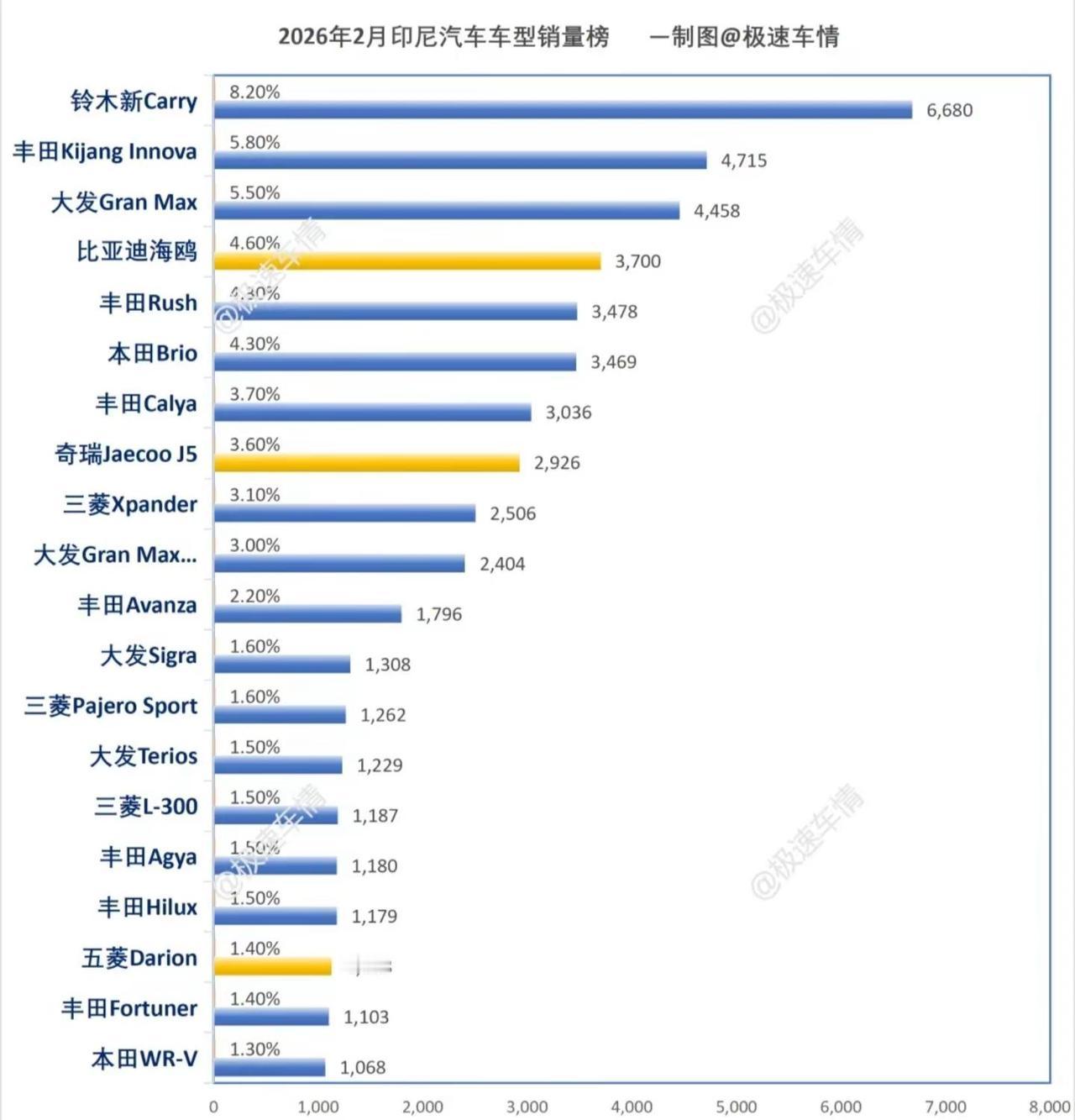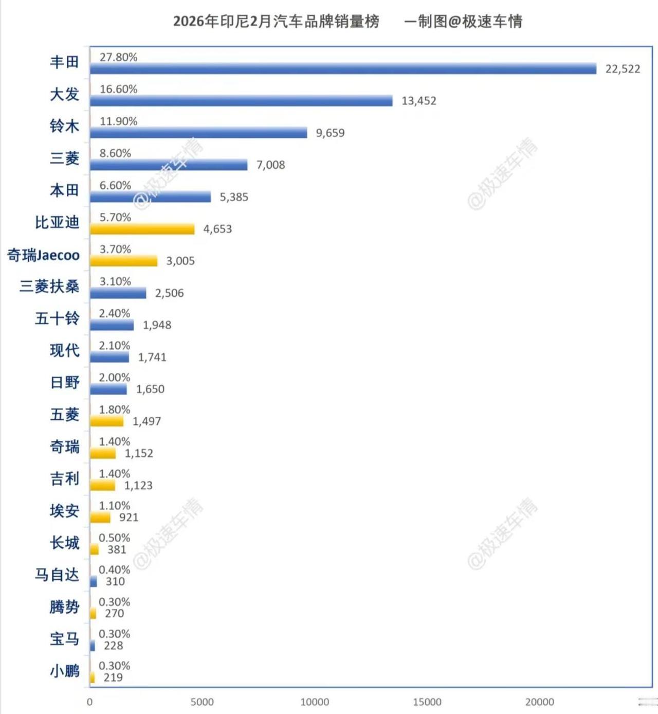 2026年2月,印尼汽车销量榜!比亚迪同比大涨,环比下滑。奇瑞同比下滑,但是奇瑞Jaecoo大涨,创历史新高,J5单品牌近3000的销量。五菱销量回暖,吉利开始上量。大家都有美好的未来!极速车情 印尼 比亚迪 奇瑞