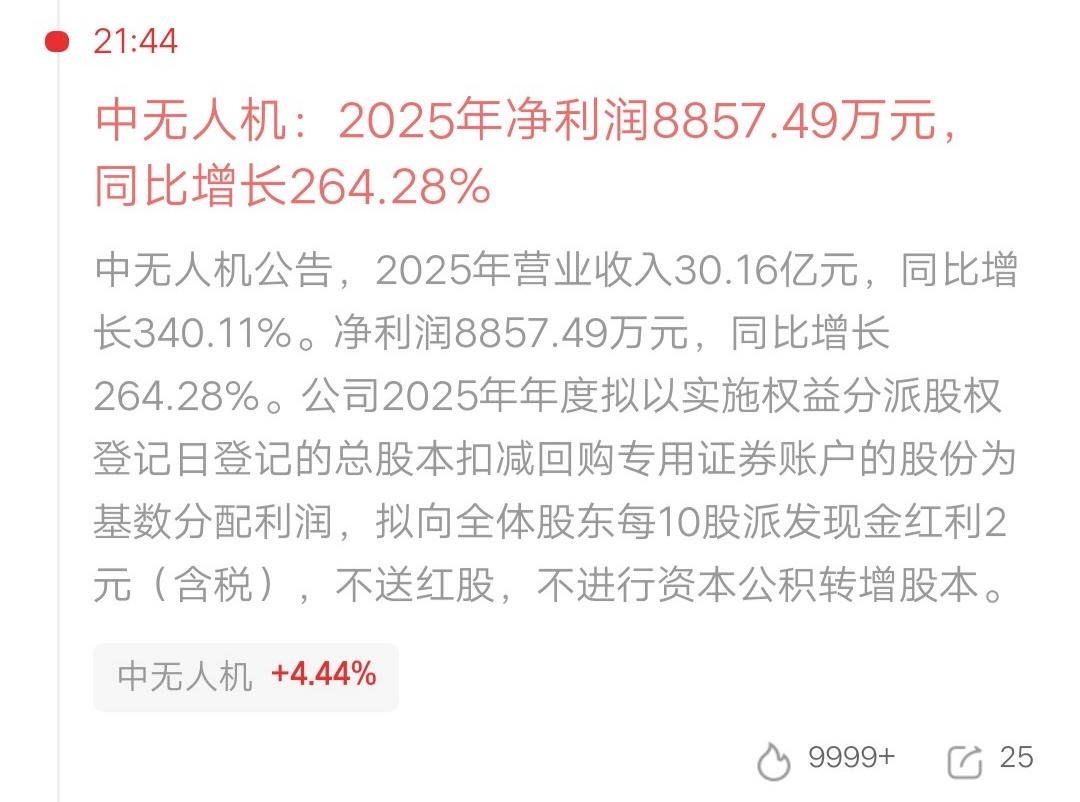 中无人机,营收增长3.4倍,利润增长2.6倍。营收30多亿元,利润8857万多。这业绩厉害了,明天股价会大涨吗?3.43万股东可能要吃大肉了。 业绩增长的原因分析: 国内军方+国际军贸订单集中落地、批量交付,交付量大幅提升。 翼龙系列(翼龙-2/3)国内外需求旺盛,军贸出口持续高增。 民用领域(应急、巡检、物流)订单同比+120%,低空经济政策催化。 中无人机2022年科创板上市,发行价32.35元,上市以来涨幅75.48%。和其他上市即巅峰的股票相比,中无人机的涨幅“很一般”,这也说明股价并没有严重泡沫。 22年10派3.52元,23年10派1.77元,25年10派2元。分红在行业排名中等偏下,在整个A股也是中等偏下,分红指标一般般。 公司属于军工装备板块,核心产品无人机系统产品及服务。