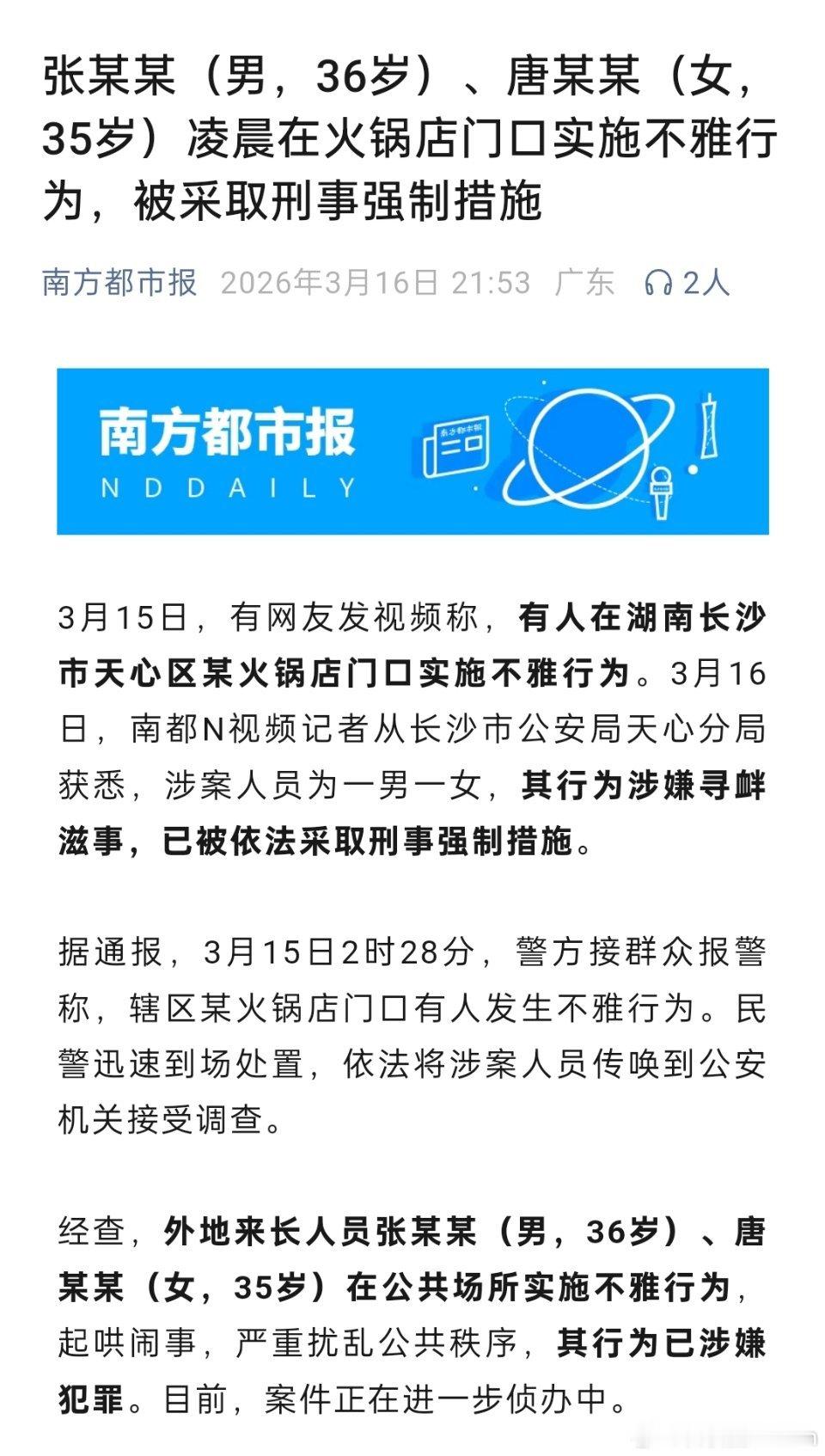 【#长沙警方通报解放西不雅事件#】#男女在火锅店门口实施不雅行为被抓#3月16
