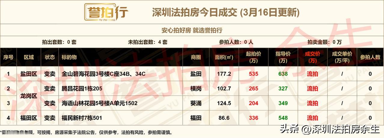 深圳法拍房:3.16成交,0成交~ 1、4套都是变卖物业,都流拍~ 深圳法拍房余生 深圳法拍房 深圳楼市 南山法拍豪宅