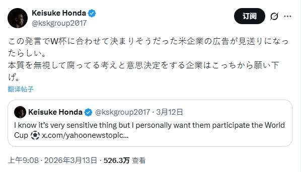 本田圭佑三观就是正,他因为说希望伊朗参加世界杯,从而与他有合作的美国企业终止了和他的广告。 本田圭佑回应因为一句话而终止合同罔顾事实、思想与决策腐朽的企业,他求之不得。 要知道这么多球星都保持沉默,唯有本田圭佑站出来仗义直言!他是真汉子! 本田圭佑曾经因南京大屠杀而道歉,并且向日本全民普及,因此他摊上事,被骂得那叫一个惨啊! 当年日本球队在亚冠上被恒大虐得不要不要的,日本在骂恒大只能靠外援,唯有本田圭佑说了真话:“在俱乐部外援也是球队的实力之一!我们不应该找借口,应该提升自己的实力!而不是埋怨恒大队的外援太厉害!” 不愧为AC米兰队中曾经穿越10号球衣的男人!不愧为世界杯上进球最多的亚洲球员。